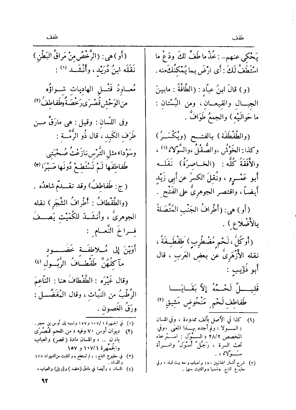 يَحْكِي عَنْهُم خُذْ مَا طَفَّ لكَ ودَعْ مَا {اسْتَطَفَّ لَكَ: أَي ارْضَ بِمَا يُمْكِنُكَ مِنْهُ. وقالَ ابنُ عبّادٍ:} الطَّافَّةُ: مَا بينَ الجِبالِ والقِيعانِ، وَمن البُسْتانِ: مَا حَوالَيْه والجمعُ {طَوَافُّ.} والطَّفْطَفَة بِالْفَتْح ويُكْسَرُ وَكَذَا: الخَوْشُ، والصُّقْلُ، والسَّوْلاءُ، والأَفَقَةُ كُلُّه: الخاصِرَةُ نَقَله أَبو عَمْرٍ و، ونُقِلَ الكسرُ عَن أَبِي زَيْدٍ أَيضاً، وَاقْتصر الجوهرِيُّ على الفَتْحِ. أَو هِيَ: أَطْرافُ الجَنْبِ المُتَّصَلَةُ بالأَضْلاعِ. أَو كُلُّ، لَحْمٍ مُضْطَرِبٍ {طِفْطَفَةٌ، نَقله الأَزْهَرِيُّ عَن بعض العَربِ، قَالَ أَبو ذُؤَيْبٍ: