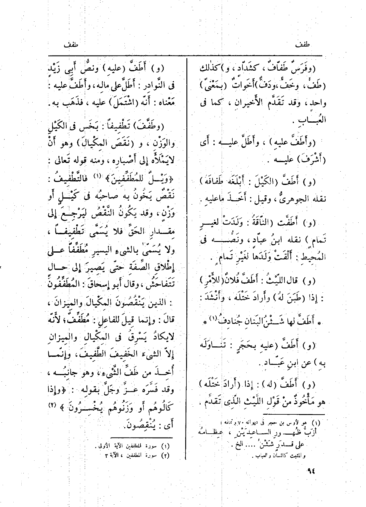 {وطَفَّفَ} تَطْفِيفاً: بَخَس فِي الكَيْلِ والوَزْنِ، ونَقَصَ المِكْيالَ وَهُوَ أَنْ لَا يَمْلأَه إِلَى أَصْبارِه، وَمِنْه قَوْله تَعَالَى: وَيْلٌ {للمُطَفِّفِينَ} فالتَّطْفِيفُ: نَقْصٌ يَخُونُ بِهِ صاحبُه فِي كَيْلٍ أَو وَزْنٍ، وَقد يَكُونُ النَّقْصُ ليَرْجِعَ إِلَى مِقدارِ الحَقِّ فَلَا يُسَمَّى {تَطْفِيفاً، وَلَا يُسَمّى بالشيءِ اليسيرِ} مُطَفِّفاً على إطْلاقِ الصِّفَةِ حَتَّى يَصِيرَ إِلَى حَال تَتَفاحَشُ، وَقَالَ أَبو إِسحاقَ: {المُطَفِّفُونَّ: الَّذين يَنْقُصُونَ المِكْيالَ والمِيزانَ، قالَ: وإِنما قِيلَ للفاعِلِ:} مُطَفِّفٌ، لأَنه لَا يكادُ يَسْرِقُ فِي المِكْيالِ والمِيزانِ إلاّ الشيءَ الخَفِيفَ الطَّفِيفَ، وَإِنَّمَا أُخِذَ من طَفِّ الشَّيءِ وَهُوَ جانِبُه، وَقد فَسَّرَه عزَّ وجَلَّ بقولهِ: وَإِذا كَالُوهُمُ أَو وَزَنُوهُم يُخْسِرُونَ أَي: يُنْقِصُونَ.