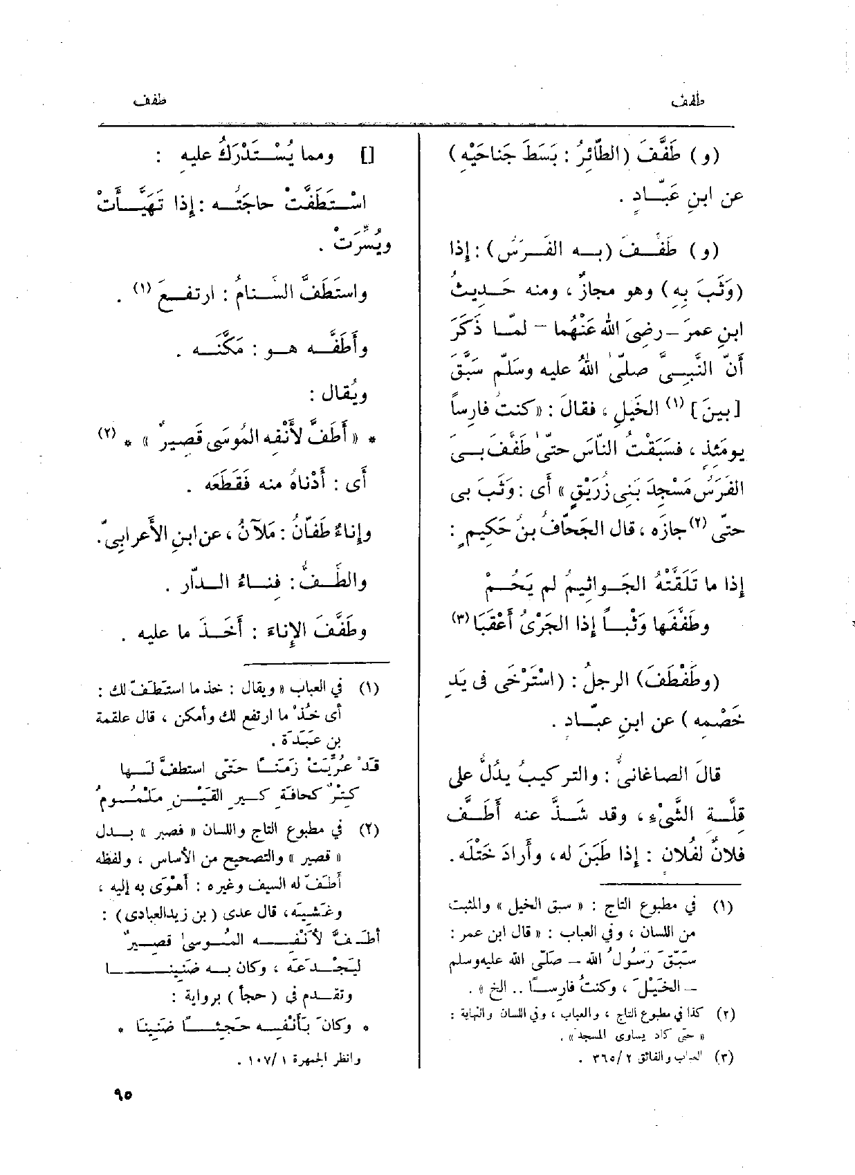 وَمِمَّا يُسْتَدْرَكُ عليهِ:} اسْتَطَفَّتْ حاجَتُه: إِذا تَهَيَّأَتْ ويُسِّرَتْ. {واستَطَفَّ السِّنَامُ: ارتفعَ.} وأَطَفَّه هُوَ: مَكَّنَه. ويُقال: أَطَفَّ لأَنْفِه المُوسَي قَصِيرٌ أَي: أَدْناهُ مِنْهُ فَقَطَعَه.