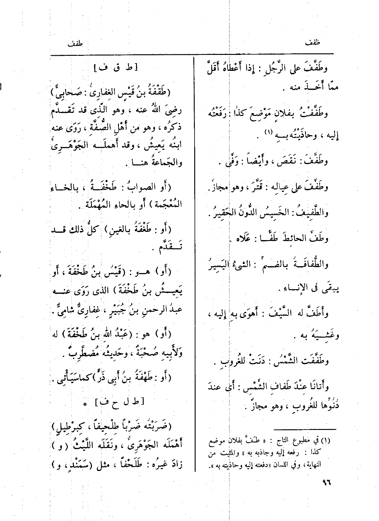 {وطَفَّفَ على الرَّجُلِ: إِذا أَعْطاهُ أَقَلَّ ممّا أَخَذَ مِنْهُ.} وطَفَّفْتُ بفلانٍ مَوْضِعَ كَذَا: رَفَعْتُه إِلَيْهِ، وحاذَيْتُه بهِ. وطَفَّفَ: نَقَصَ، وأَيْضَاً: وَفِّي. وطَفَّفَ على عِيالهِ: قَتَّرَ، وَهُوَ مجَاز. {والطَّفِيفُ: الخَسِيسُ الدُّونُ الحَقِيرُ.} وطَفّ الحائِطَ طَفَّا: عَلاَه. {والطُّفافَةُ بالضمِّ: الشيءُ اليَسِيرُ يبقَى فِي الإِناءِ،} وأَطَفَّ لَهُ السَّيْفَ: أَهوَى بهِ إِليه، وغَشِيَهُ بِهِ. {وطَفَّفَت الشَّمْسُ: دَنَتْ للغُروبِ. وأَتانَا عِنْدَ) } طَفافِ الشَّمْسِ: أَي عندَ دُنُوِّها للغُروبِ، وَهُوَ مجازٌ.