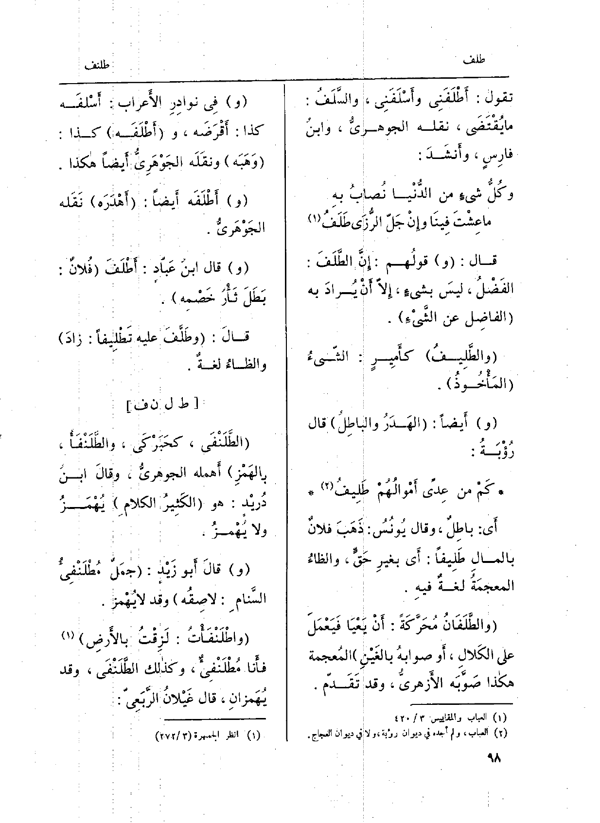 قَالَ: وقولُهم: إِنَّ الطَّلَفَ: الفَضْلُ، ليسَ بشيءٍ، وإلاّ أَنْ يُرادَ بِهِ الفاضِل عَن الشَّيْءِ.