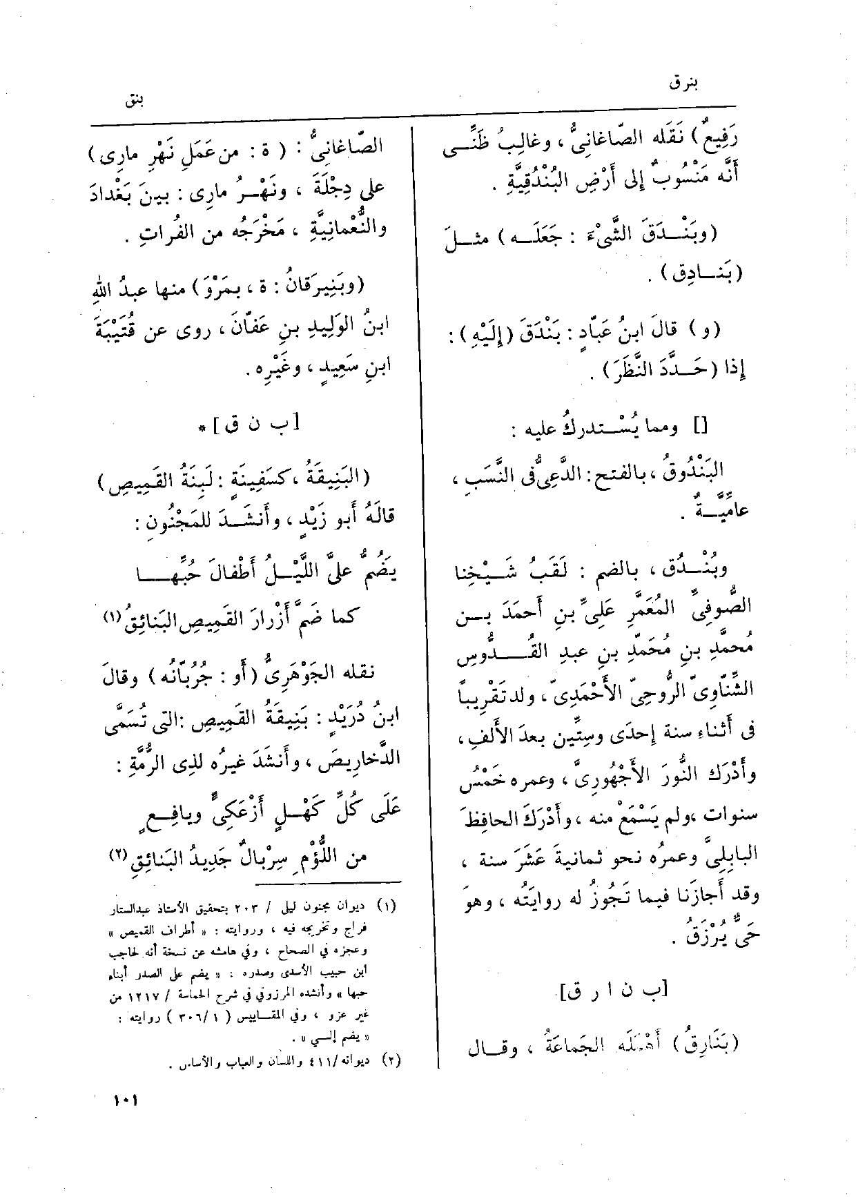 بنارق أهمله الْجَمَاعَة وَقَالَ الصّاغانِيُّ: ة: من عَمَلِ نَهْرِ مارِي على دِجلَةَ، ونَهْرُ مارِي: بينَ بَغْدادَ والنّعْمانِيَّةِ، مَخْرَجُه من الفُراتِ. وبَنِيرَقانُ: ة، بمَرْوَ مِنْهَا عبدُ اللهِ ابنُ الوَلِيدِ بنِ عَفاّنَ، روى عَن قُتَيْبَةَ ابنِ سَعِيدٍ، وغَيْرِه.