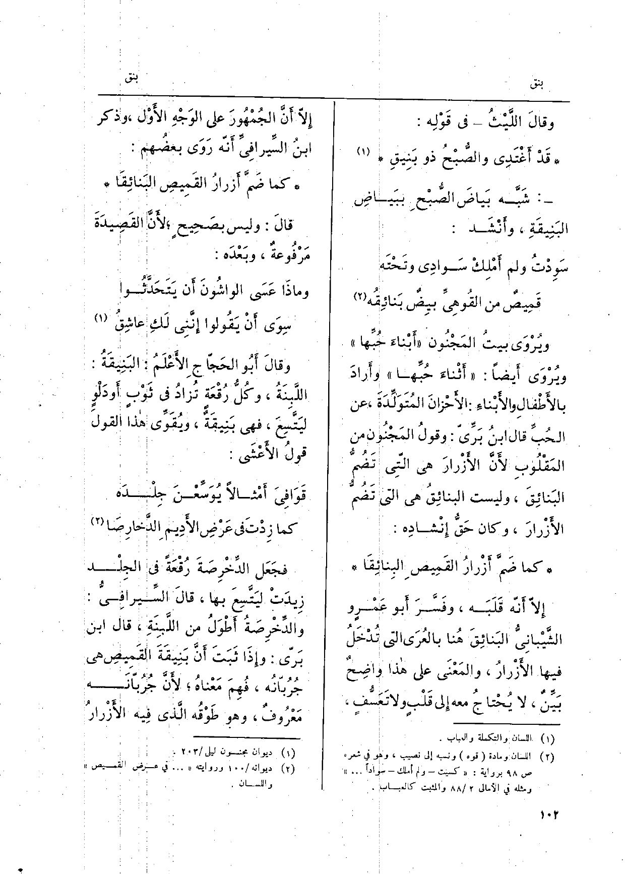 ويرْوَى بيتُ المجنُون. أَبناءَ حُبِّها ويُرْوَى أَيضاً: أَثْناء حُبِّها وأَرادَ بالأَطفالِ والأَبْناءَ: الأَحْزانَ المتَوَلِّدَةَ، عَن الحبِّ قَالَ ابنُ بَرِّىّ: وقولُ المَجْنون من المَقْلُوبِ لأَنَّ الأَزْرارَ هِيَ التِّي تَضُم البَنائِقَ، وَلَيْسَت البنائِقُ هِيَ الَّتِي تَضُم الأَزْرارَ، وَكَانَ حَقُّ إِنْشادِه: كَمَا ضَمَّ أَزْرارُ القَمِيص البِنائِقَا إِلاّ أَنهّ قَلَبَه، وفسرَ أَبو عمْرو الشَّيْبانيُّ البَنائِقَ هُنا بالعُرَى الَّتِي تُدْخَلُ فِيهَا الأَزْرارُ، والمَعْنى على هَذَا واضِحٌ بَيِّنٌ، لَا يُحْتاجُ مَعَه إِلى قَلبٍ وَلَا تَعَسُّفٍ، إِلاّ أَنِّ الْجُمْهُور على الوَجْهِ الأَوْل، وَذكر ابنُ السِّيرافِيِّ أَنهّ رَوَى بعضُهم: كَمَا ضَمَّ أَزرارُ القَمِيصِ البَنائِقَا قالَ: وَلَيْسَ بصَحِيحٍ، لأَنَّ القَصِيدَةَ مَرْفوعةٌ، وبَعْدَه: