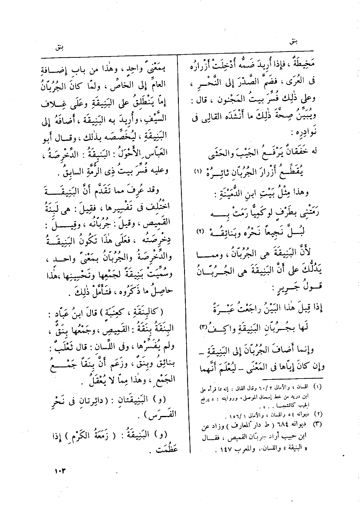 ابْن برّي: وإِذَا ثَبَتَ أَنَّ بَنِيقَةَ القميصِ هِيَ جُرُبانه، فهم مَعْناهُ، لأَنَّ جُرُباَّنَه مَعرُوفٌ، وَهُوَ طَوْقُه الَّذي فِيه الأَزْرارُ مَخِيطَةٌ، فإِذا أُرِيدَ ضَمه أدْخِلَتْ أَزْرارُه فِي العُرَى، فضَمَّ الصَّدْرَ إِلى النَّحْرِ، وعَلى ذلِك فُسِّرَ بيتُ المَجْنون، قَالَ: ويُبَيَنُ صِحَّةَ ذلِكَ مَا أَنْشَدَه القالِي فِي نَوادِرِه: