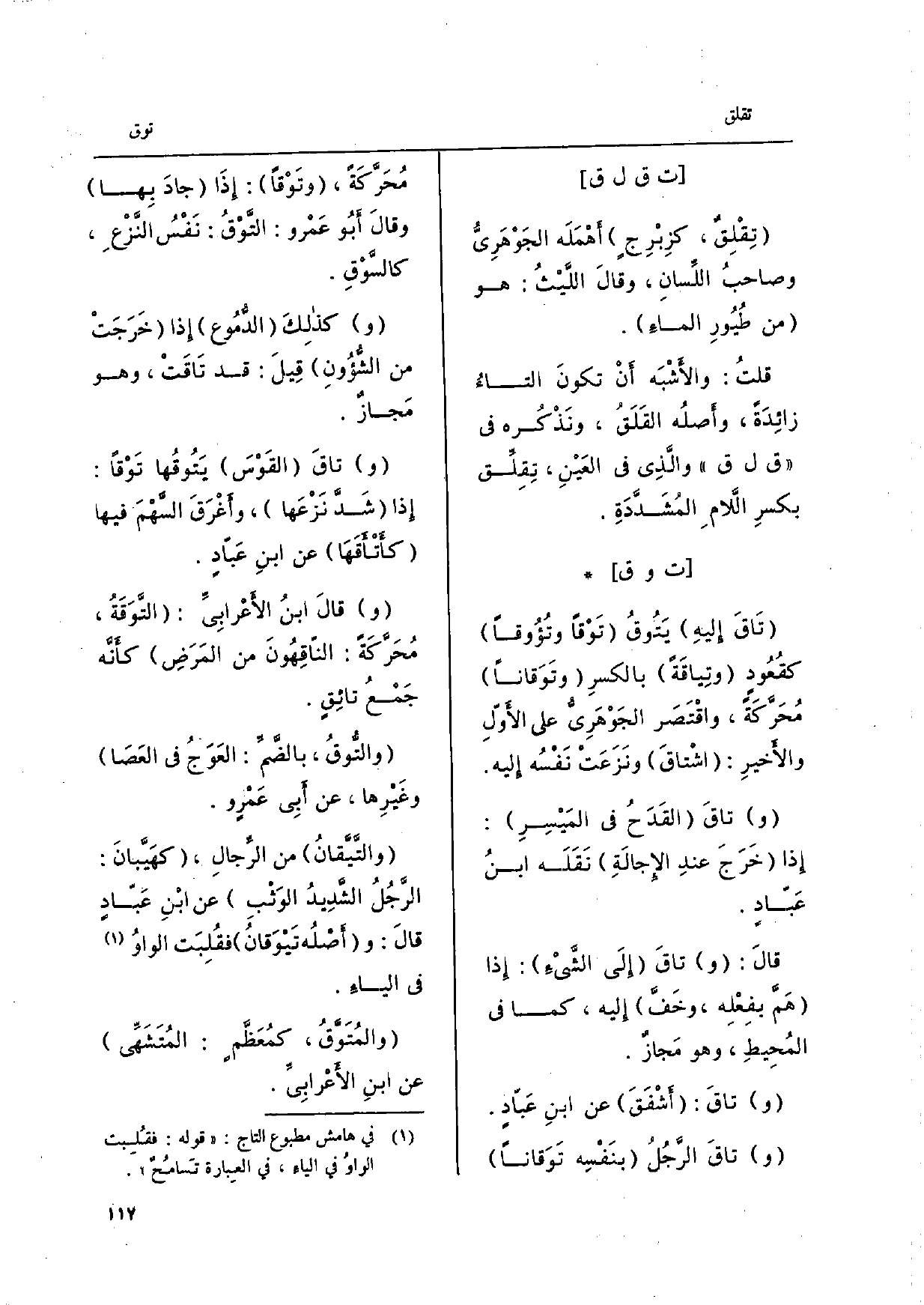 } تاق إِلَيْهِ {يتوق} توقاً {وتؤوقاً كقعود} وتياقة بِالْكَسْرِ {وتوقاناً محركة وَاقْتصر الْجَوْهَرِي على الأول والأخير: اشتاق ونزعت نَفسه إِلَيْهِ، وتاق الْقدح فِي الميسر إِذا خرج عِنْد الإجالة نَقله ابْن عباد، قَالَ: وتاق إِلَى الشَّيْء إِذا هم بِفِعْلِهِ وخف إِلَيْهِ كَمَا فِي الْمُحِيط وَهُوَ مجَاز. وتاق أشْفق عَن ابْن عباد وتاق الرجل بِنَفسِهِ} توقاناً محركة {وتوقاً إِذا جاد بهَا وَقَالَ أَبُو عَمْرو:} التوق نفس النزع كالسوق. وَكَذَلِكَ الدُّمُوع إِذا خرجت من الشؤون قيل قد {تاقت وَهُوَ مجَاز. وتاق الْقوس} يتوقها توقاً إِذا شدّ نَزعهَا وَأغْرقَ السهْم فِيهَا كأتأقها عَن ابْن عباد. وَقَالَ ابْن الْأَعرَابِي {التوقة محركة الناقهون من الْمَرَض كَأَنَّهُ جمع} تائق. {والتوق بِالضَّمِّ العوج فِي الْعَصَا وَغَيرهَا عَن أبي عَمْرو.} والتيقان من الرِّجَال كهيبان الرجل الشَّديد الوثب عَن ابْن عباد قَالَ وَأَصله تيوقان فقلبت الْوَاو فِي الْيَاء.! والمتوق كمعظم المتشهى عَن ابْن الْأَعرَابِي.