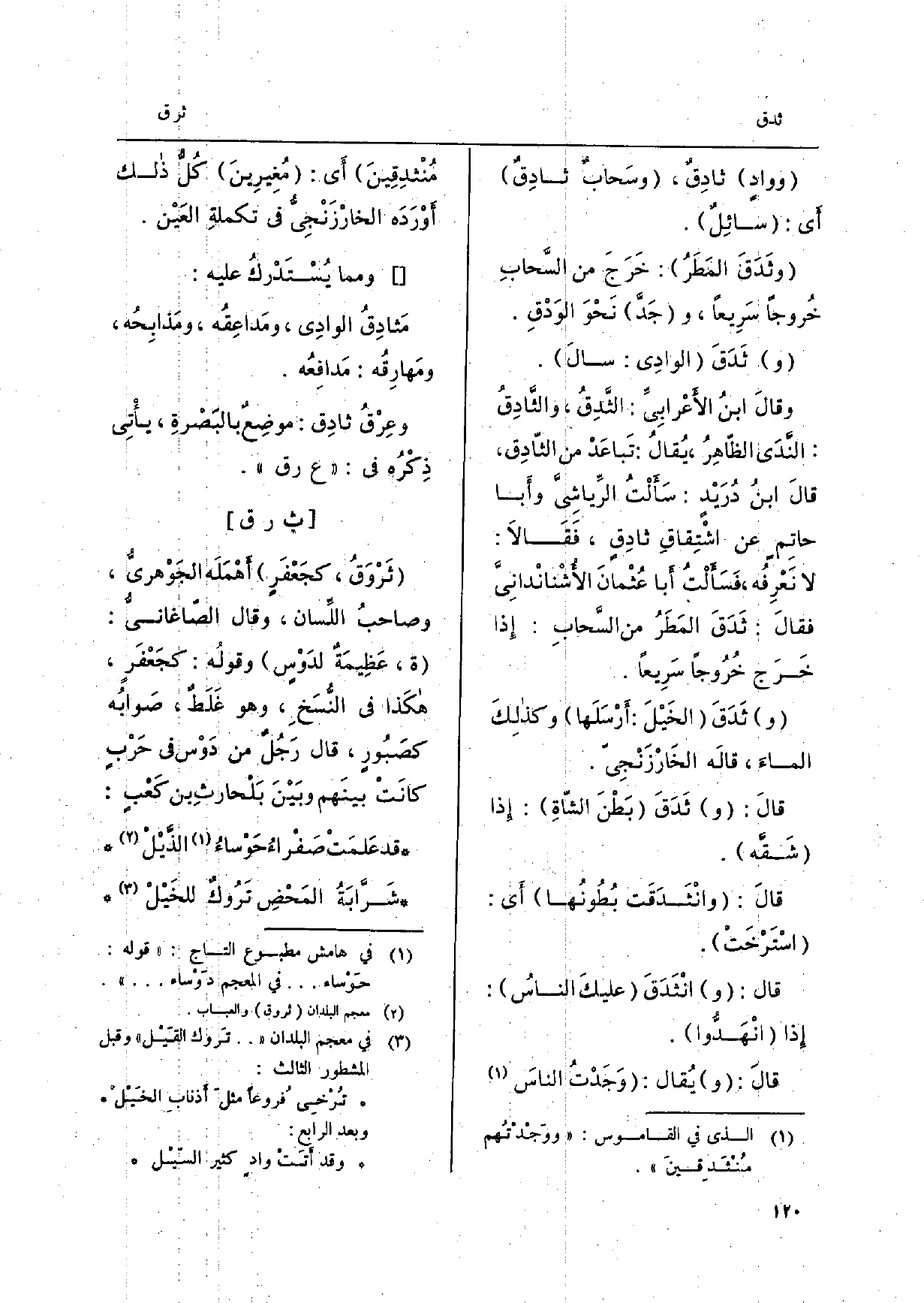 الثادق قَالَ ابْن دُرَيْد سَأَلت الرياشي وَأَبا حَاتِم عَن اشتقاق ثادق فَقَالَا: لَا نعرفه فَسَأَلت أَبَا عُثْمَان الأشنانداني فَقَالَ: ثدق الْمَطَر من السَّحَاب إِذا خرج خُرُوجًا سَرِيعا. وثدق الْخَيل أرسلها وَكَذَلِكَ المَاء قَالَه الخارزنجي. قَالَ: وثدق بطن الشَّاة إِذا شقَّه. قَالَ وانثدقت بطونها أَي استرخت. قَالَ: وانثدق عَلَيْك النَّاس إِذا انهدوا. قَالَ وَيُقَال وجدت النَّاس منثدقين أَي مغيرين كل ذَلِك أوردهُ الخارونجي فِي تَكْمِلَة الْعين.