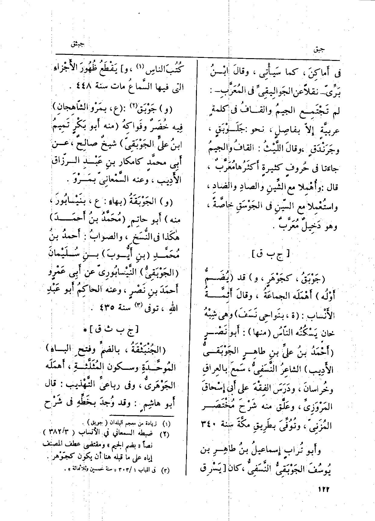 جَوْبَقُ، كجَوْهَرٍ، وَقد يُضَمّ أوْلُه أهْمَلَه الجماعَةُ، وقالَ أَئِمّة الأنْساب: ة، بنواحِي نَسَفَ وَهِي شِبْهُ خَان يسكنُه النَّاس مِنْهَا: أَبو نَصْرٍ أحْمَد بنُ عليِّ بنِ طاهِرٍ الجَوبقَيُّ الأدِيب الشاعِرُ النَّسَفِي، سَمعَ بالعِراقِ وخُراسانَ، ودَرَسَ الفِقْهَ علىِ أَبي إِسْحاقَ المَرْوَزِيِّ، وعَلق مِنْهُ شَرْح مُخْتَصَر المُزَنِيّ، وتُوُفِّي بطَرِيقِ مكَّةَ سنة. وَأَبُو تُرابٍ إِسماعيلُ بنُ طاهِرِ بن يُوسُفَ الجَوْبَقِيُّ النَّسَفِيُّ، كَانَ يَسْرِق كتبَ الناسِ، ويَقطع ظَهورَ الأجْزاءَ الَّتِي فِيهَا السَّماعُ مَاتَ سنة. وجوبق: ع، بمَرْو الشّاهِجانِ فِيه خُضَرٌ وفَواكهُ مِنْهُ أَبو بَكْرٍ تَمِيمُ ابنُ عَليّ الجَوْبَقِيَّ شيخٌ صالِحٌ، عَن أبِي محمَّدٍ كامكار بنِ عَبْدِ الرّزاق الأدِيب، وَعنهُ السَّمْعانِي بمَرْوَ. والجَوبَقَةُ بهاءَ: ع، بنَيْسابورَ، مِنْهُ أَبو حاتِم مُحَمدُ بنُ أحمَدَ هكَذا فِي النسَخ، والصوابُ: أحمدُ بنُ مُحَمَّدِ بنِ أَيُّوبَ بنِ سُلَيْمانَ الجَوْبَقِيُّ النيسابُورِيّ عَن أبِي عَمْرو أَحمَدَ بنِ نَصْرٍ، وَعنهُ الحاكِم أَبو عَبْدِ اللهِ، توفّي سنة.