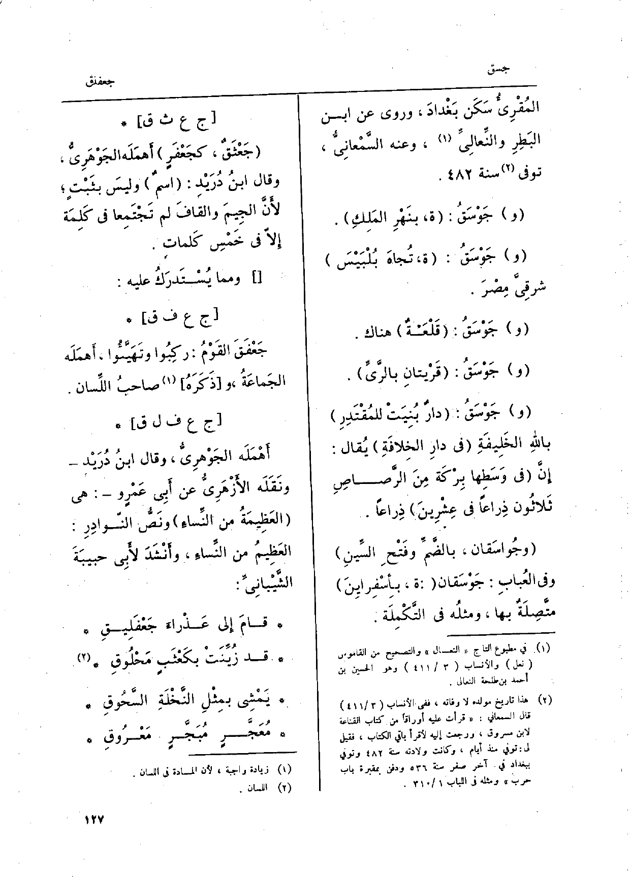 المُقْرِئ سَكَن بَغْدادَ، وروى عَن ابْن البَطِرِ والنِّعالِيِّ، وَعنهُ السَّمْعانِيّ، توفّي سنة. وجَوْسَقُ: ة، بنَهرِ المَلِكِ. وجَوْسَقُ: ة، تجاهَ بُلْبَيْسَ شرقِيَّ مِصْرَ. وجَوْسَق: قَلْعةٌ هُنَاكَ. وجَوْسَقُ: قَرْيتانِ بالرَّيِّ. وجَوْسَقُ: دارٌ بُنِيَتْ للمُقْتَدِرِ باللهِ الخَلِيفَةِ فِي دارِ الخِلافَةِ يُقال: إنَّ فِي وَسَطِها بِركَة مِنَ الرَّصاصٍ ثَلاثُون ذِراعاً فِي عِشرِينَ ذِراعاً. وجُواسَقان، بالضَّمِّ وفَتْح السِّينِ وَفِي العُبابِ: جَوْسَقان: ة، بأِسْفرايِنَ متَّصِلَةٌ بهَا، وَمثله فِي التَّكْمِلَة.