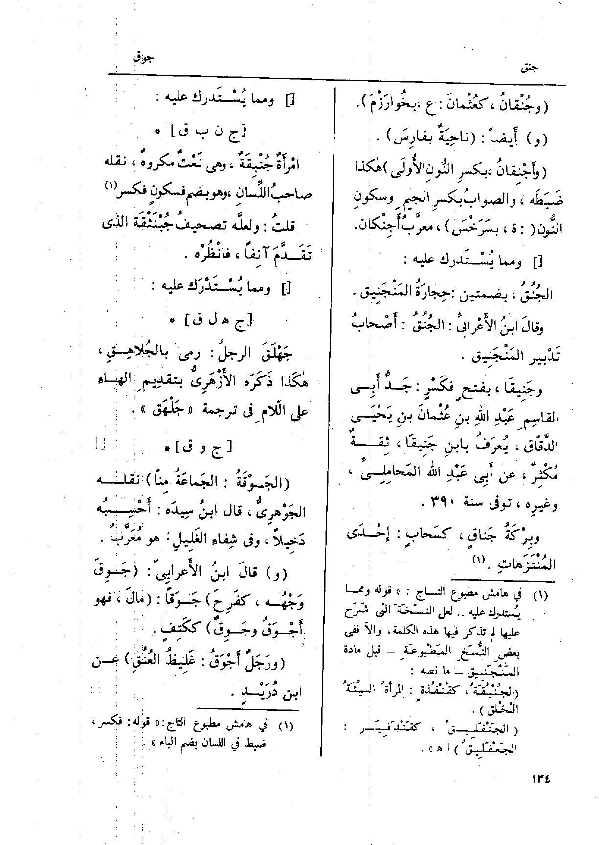 وَمِمَّا يُسْتَدرك عَلَيْهِ: الجُنقُ، بِضَمَّتَيْنِ: حِجارَةُ المَنْجَنِيق. وقالَ ابْن الأَعْرابيّ: الجُنقُ: أصْحاب تَدْبير المَنْجَنِيق. وجَنِيقَا، بفتحٍ فكَسْر: جَدُّ أَبِي القاسِمِ عَبْدِ اللهِ بنِ عُثْمانَ بنِ يَحْيَى الدَّقّاق، يعرَفُ بابنِ جَنِيقَا، ثِقة مُكْثِرٌ، عَن أبِي عَبْدِ الله المَحامِلِيِّ، وغيرِه، توفّي سنة. وبِرْكَةُ جَناقٍ، كسَحابٍ: إِحْدَى المُنْتَزَهاتِ.