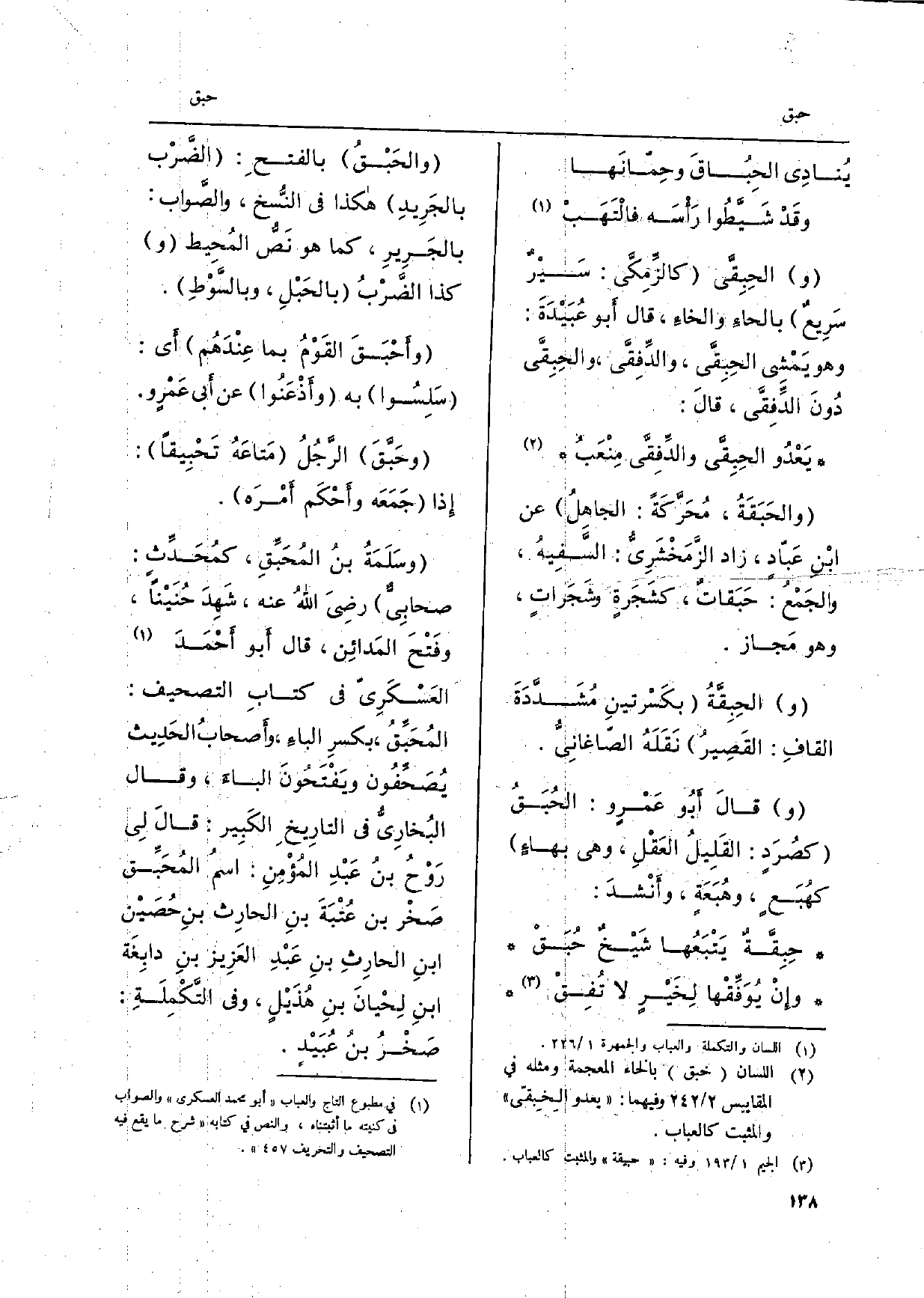 والحِبِقَّى كالزِّمِكَّى: سَيْرٌ سَرِيع بالحاءَ وَالْخَاء، قَالَ أَبُو عُبَيْدَةَ: وَهُوَ يَمْشي الحِبِقَّى، والدِّفِقَّى، والحِبِقى دُونَ الدًّفِقى، قالَ: يَعْدُو الحِبِقَّى والدِّفِقى مِنْعبُ والحَبَقَةُ، مُحَركةً: الجاهلُ عَن ابْنِ عَباّدٍ، زَاد الزَّمَخْشَرِيُّ: السًّفِيهُ، والجَمْعُ: حَبَقات، كشَجَرةٍ شَجَراتٍ، وَهُوَ مَجاز. والحِبِقَّةُ بكَسْرتينِ مُشَدَّدَةَ القافِ: القَصِيرُ نَقَلَهُ الصّاغانِيّ. وقالَ أبُو عَمرو: الحُبَقُ كصُرَد: القَلِيلُ العَقْلِ، وَهِي بهاءً كهُبَع، وهُبَعَةٍ، وأَنْشدَ: حِبِقَّة يَتْبَعُها شَيْخ حُبَقْ وإنْ يوَفِّقْها لخَير لَا تفق والحَبْقُ بِالْفَتْح: الضَّرْب بالجَرِيدِ هَكَذَا فِي النسُّخ، والصَّواب: بالجَرِيرِ، كَمَا هُوَ نَصُّ المُحِيط وَكَذَا الضَّرْبُ بالحَبْلِ، وبالسَّوْطِ. وأحْبَقَ القَوْمُ بِمَا عِنْدَهُم أَي: سَلِسُوا بِهِ وأذعَنُوا عَن أَبي) عَمْرو. وحَبَّقَ الرَّجُلُ مَتاعَهُ تَحْبِيقاً: إِذا جَمَعَه وأحْكَم أَمْرَه. وسَلَمَةُ بنُ المُحَبِّقِ، كمُحَدِّث: صحابِي رضِي اللهُ عَنهُ، شَهِدَ حُنَيْناً، وفَتْحَ المَدائِن، قَالَ أَبو أَحْمَدَ العَسْكَرِيّ فِي كتابِ التَّصْحِيف: المُحَبِّقُ، بكسرِ الباءَ، وأَصحابُ الحَدِيث يُصَحِّفُون ويَفْتَحُونَ الْبَاء، وَقَالَ البُخارِيُّ فِي التارِيخ الكَبِير: قالَ لِي رَوْحُ بنُ عَبْدِ المُؤْمِنِ: اسمُ المُحَبِّق صَخر بن عُتْبَةَ بنِ الحارِث بنِ حُصَيْن ابنِ الحارِثِ بنِ عَبْدِ العَزِيز بنِ دابِغَة ابنِ لِحْيانَ بنِ هُذَيلٍ، وَفِي التَّكْمِلَةِ: صَخْرُ بنُ عُبَيْد.