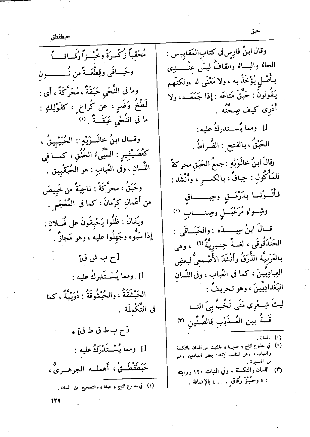 وَقَالَ ابنُ فارِسٍ فِي كتابِ المَقايِيس: الحاءُ والباءُ وَالْقَاف ليسَ عِنْدِي بأصْل يُؤْخَذُ بِهِ، وَلَا مَعْنَى لَهُ، ولكنهّم يقُولونَ: حبقَ مَتاعَه: إِذا جَمَعَه، وَلَا أدْرِي كَيفَ صِحَّتُه.