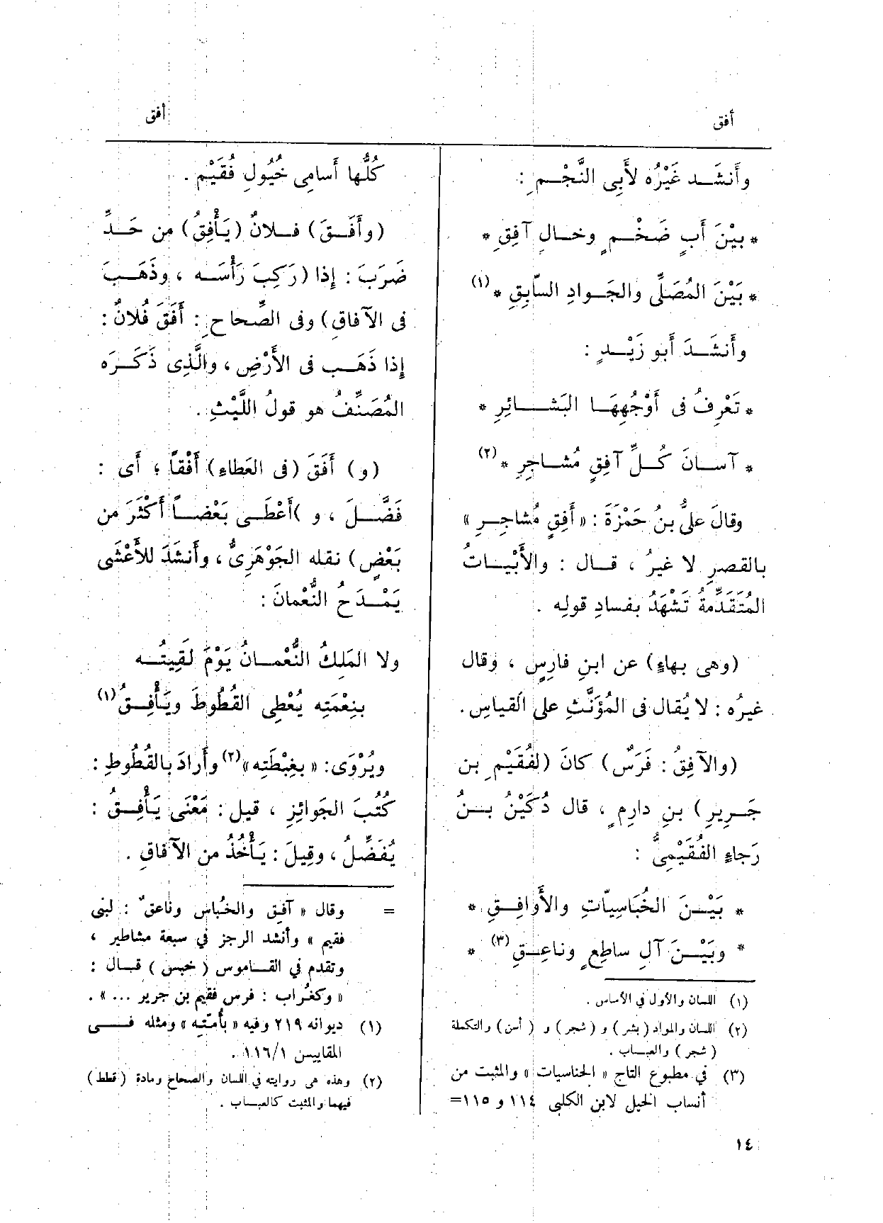 كُلُّها أَسامِي خُيُولِ فُقَيْم. {وأَفقَ فلانٌ} يَأفِقُ من حَدِّ ضَرَبَ: إِذا رَكِبَ رَأسَه، وذَهَب فِي {الْآفَاق وَفِي الصِّحاحَ: أَفَقَ فُلانٌ: إِذا ذَهَب فِي الأَرْضِ، وَالَّذِي ذَكَرَه المُصَنِّفُ هُوَ قولُ اللَّيْثِ. (و) } أَفَقَ فِي العَطاءَ {أفْقاً، أَي: فَضَّلَ، وأَعْطَى بَعْضاً أَكثَرَ من بَعْضٍ نَقله الجَوْهَرِي، وأنشَدَ للأعْشَى يَمْدَح النُّعْمانَ: