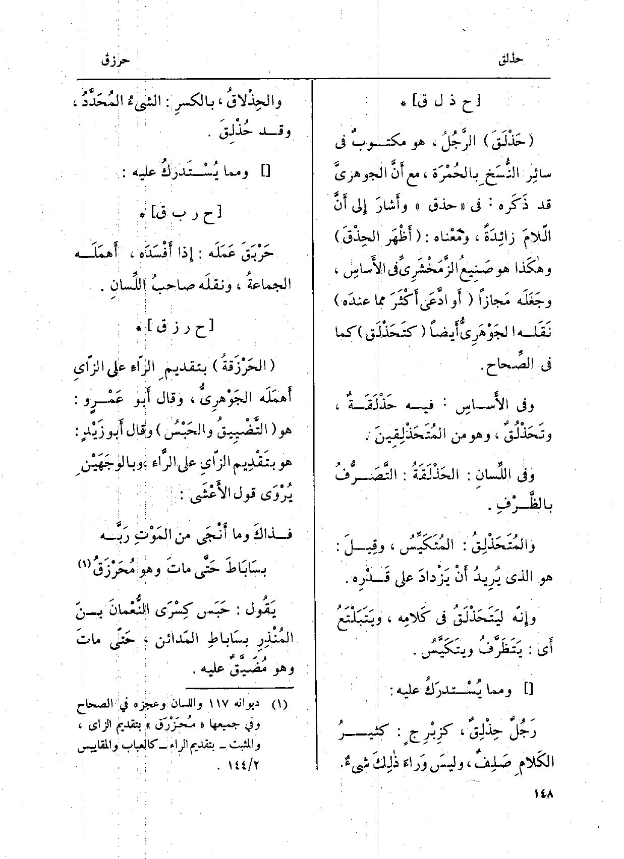 وَمِمَّا يُسْتدرَكُ عَلَيْهِ: رَجُل حِذْلِقٌ، كزِبرِجٍ: كثير الكَلامِ صَلِفٌ، وليسَ وَراءَ ذَلِك شَيْء.