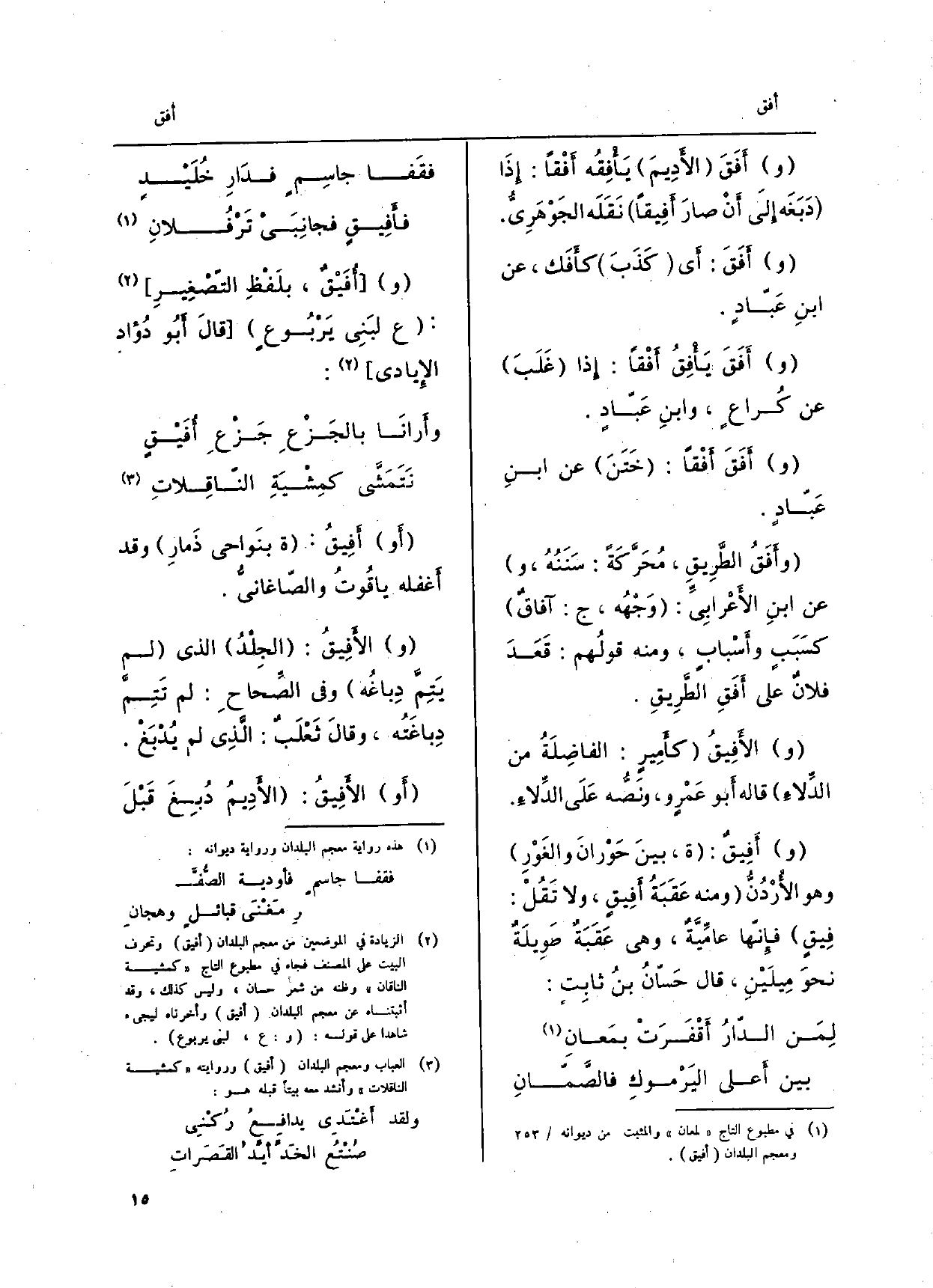 ونَصه عَلَى الدِّلاء. (و) {أَفِيقٌ: ة، بينَ حَورانَ والغَوْرِ وَهُوَ الأرْدُنُّ وَمِنْه عَقَبَةُ أفِيقٍ، وَلَا تَقُلْ: فِيقٍ فإنهّا عامِّيَّةٌ، وَهِي عَقَبَةٌ طوِيلَةٌ نحوَ مِيلَيْنِ، قَالَ حَسّانُ بنُ ثابِت: