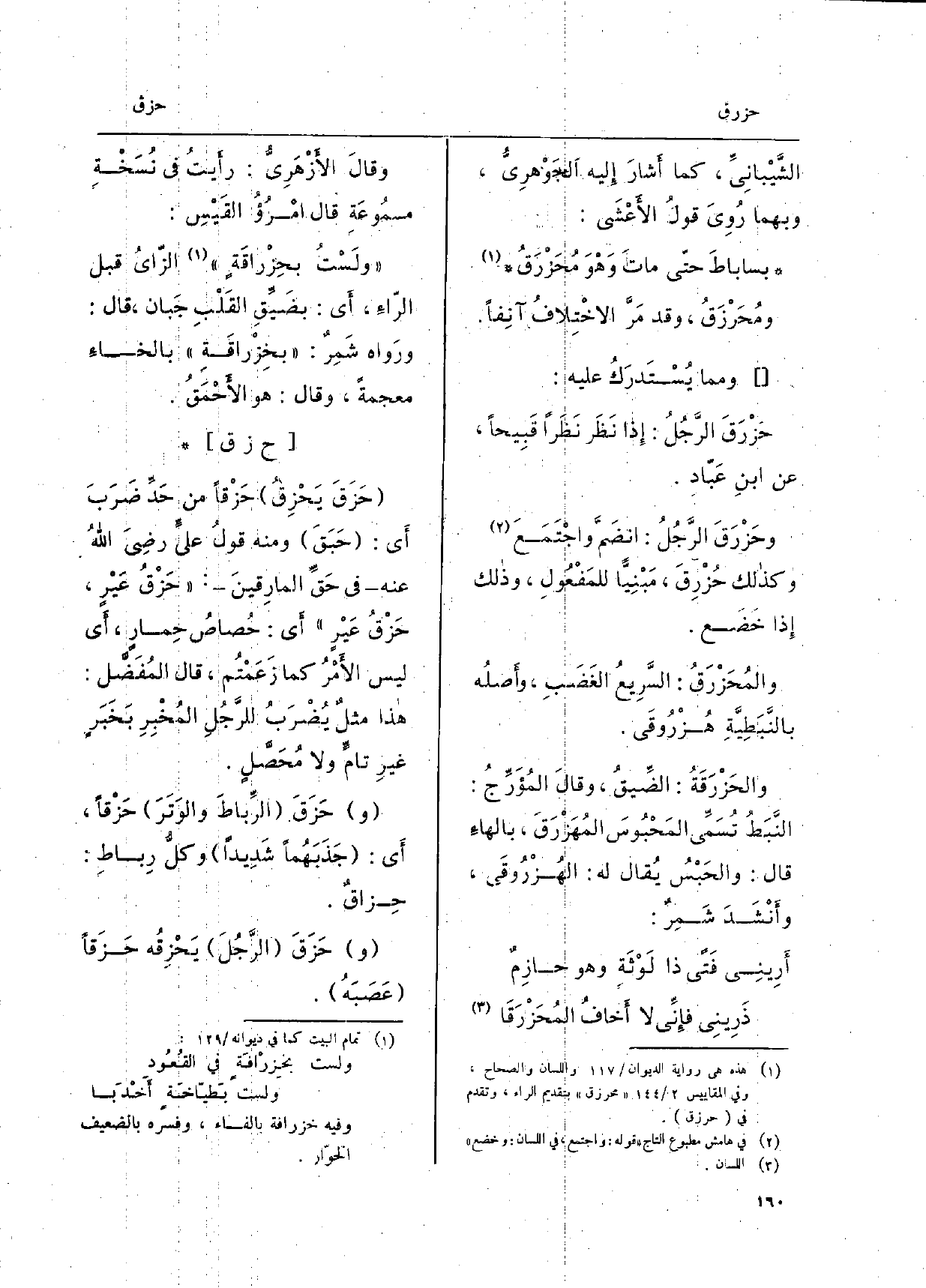 حزق يحزِقُ حَزْقاً من حَدِّ ضَرَبَ أَي: حَبَق وَمِنْه قولُ عَليّ رضِيَ اللهُ عَنهُ فِي حَقَ المارِقينَ: حَزْقُ عَيْر، حَزْقُ عَيْرٍ أَي: حُصاصُ حِمارٍ، أَي لَيْسَ الأَمْر كَمَا زَعَمْتم، قَالَ المُفضل: هَذَا مثلٌ يضْرَبُ للرَّجُلِ المُخْبِرِ بَخبرٍ غيرِ تامِّ وَلَا مُحَصلٍ. وحَزَقَ الرِّباطَ والوَتَرَ حَزْقاً، أَي: جَذَبَهُما شَدِيداً وكلُّ رِباطِ: حزاقٌ. وحَزَقَ الرَّجُلَ يَحزقه حزَقاً عَصَبَهُ.
