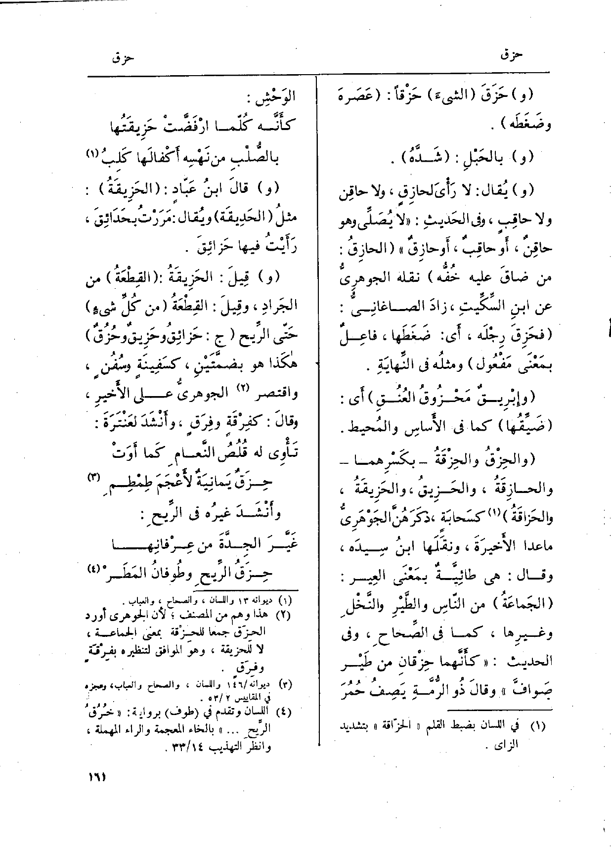 وقالَ ابنُ عَبّادٍ: الحَزِيقَةُ: مثلُ الحَدِيقَة ويُقال: مَرَرْتُ بحَدَائقَ، رَأَيت فِيهَا حزائق. وقِيلَ: الحَزِيقَةُ: القطْعَة من الجَرادِ، وقِيلَ: القِطْعَةُ من كُل شيءٍ حَتّى الرِّيح ج: حَزائِقُ وحَزِيق وحُزقٌ هكَذا هُوَ بضمتَينِ، كسَفِينَةٍ وسُفُن، وَاقْتصر الْجَوْهَرِي على الأخيرِ، وَقَالَ: كفِرْقَةٍ وفِرَق، وأنشَدَ لعَنْتَرَةَ:
