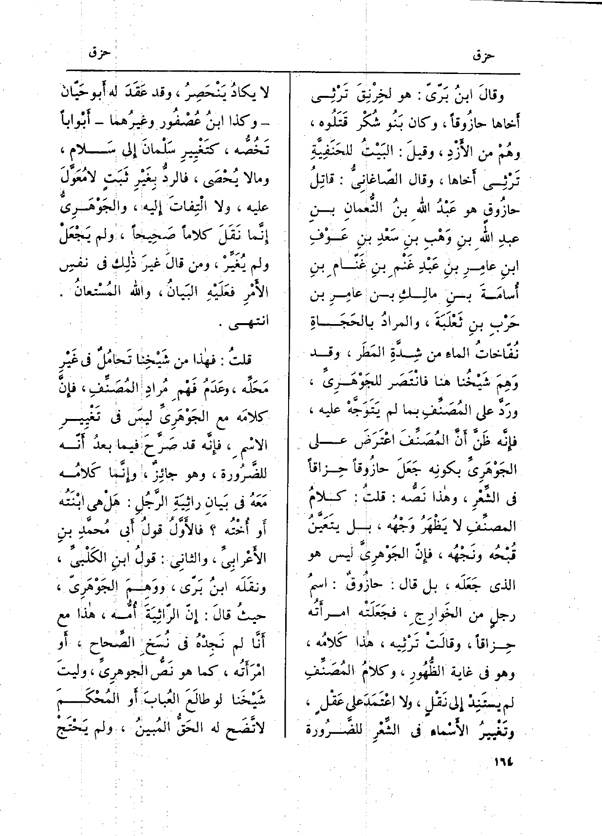 وقالَ ابنُ بَرّيّ: هُوَ لخِرنِقَ تَرْثِى أَخاها حازُوقاً، وَكَانَ بنُو شُكْر قَتَلُوه، وهُمْ من الأزْدِ، وقيلَ: البَيْتُ للحَنَفِيَّةِ تَرْثِى أخاها، وَقَالَ الصّاغانِي: قاتِلُ حازُوق هُوَ عَبْد الله بنُ النعمانِ بنِ عبدِ الله بنِ وَهْبِ بنِ سَعْدِ بنِ عوْفِ ابنِ عامِرِ بنِ عَبْدِ غَنْم بنِ غَنّام بنِ أسامَةَ بن مالِك بن عامِرِ بن حَربِ بنِ ثَعْلَبَةَ، والمرادُ بالحَجَاةِ نُفِّاخاتُ الماءَ من شِدَّةِ المَطَر، وَقد وَهِمَ شَيْخنا هُنَا فانْتَصَر للجَوْهَرِيِّ، ورَدَّ على المُصَنّفِ بِمَا لم يَتَوَجَّهْ عَلَيْهِ، فَإِنَّهُ ظَنَّ أنَّ المُصَنِّفَ اعْتَرَضَ على الجَوْهَرِيِّ بكونِه جَعَلَ حازُوقاً حِزاقاً فِي الشِّعْرِ، وَهَذَا نَصه: قلتُ: كلامُ المصنِّف لَا يَظْهَرُ وَجْهُه، بل يتَعَيَّن قُّبحُه ونَجْهُه، فَإِن الجَوْهرِيَّ لَيْسَ هُوَ الَّذِي جَعَلَه، بل قَالَ: حازوقٌ: اسمُ رجل من الخَوارِج، فجَعَلَتْه امرأَتُه حِزاقاً، وقالَتْ تَرْثِيه، هَذَا كَلامُه، وَهُوَ فِي غَايَة الظُّهُورِ، وكلامُ المُصَنِّفِ لم يستَنِد إِلى نَقْل، وَلَا اعْتَمَدَ على عَقْل، وتَغييرُ الْأَسْمَاء فِي الشعرِ للضَّرُورة لَا يكادُ يَنْحَصِرُ، وَقد عَقَدَ لَهُ أَبُو حَيّان وَكَذَا ابنُ عُصْفُور وغيرُهما أَبْواباً تَخصُّه، كتَغْيِيرِ سلْمان إِلَى سَلام، وَمَا لَا يُحْصَى، فالرد بِغَيْرِ ثَبَتٍ لَا مُعَولَ عَلَيْهِ، وَلَا الْتِفاتَ إِليه، والجَوْهَرِي إِنما نَقَلَ كلَاما صَحِيحاً، وَلم يَجْعَلْ وَلم يغَيِّرْ، وَمن قالَ غيرَ ذلِك فِي نفسِ الأمْرِ فعَلَيْهِ البَيان، وَالله المُسْتعانُ. انْتهى. قلتُ: فَهَذَا من شَيخِنا تَحامل فِي غَيْرِ مَحَله، وعَدَمُ فَهْم مرادِ المُصَنفِ، فإنَّ كلامَه مَعَ الجَوْهَرِيٍّ ليسَ فِي تَغْييرِ الاسمِ، فَإِنَّهُ قد صَرحَ فِيمَا بعدُ أَنّه للضَّرُورة، وَهُوَ جائِز، وإِنَّما كَلامُه مَعًهُ فِي بَيانِ راثِيَةِ الرَّجُلِ: هَلْ هِيَ ابْنته أَو أخْتُه فالأَوَّلُ قولُ أَبي محمَّدِ بنِ الأعْرابِي، والثانِي: قولُ ابنِ الكَلْبيَ، ونقَلّه ابنُ بَرّي، ووَهِمَ الجَوْهَرِيّ، حيثُ قالَ: إنّ الرّاثِيَةَ أمه، هَذَا مَعَ أنَّا لم نَجِدْهُ فِي نسَخ الصِّحاح، أَو امرَأَتُه، كَمَا هُوَ نصُّ الجوهرِيَ، وليتَ شَيخَنا لَو طالع العُبابَ أَو المُحْكَمَ لاتضَح لَهُ الحَقُّ المبينُ، وَلم يَحْتَج