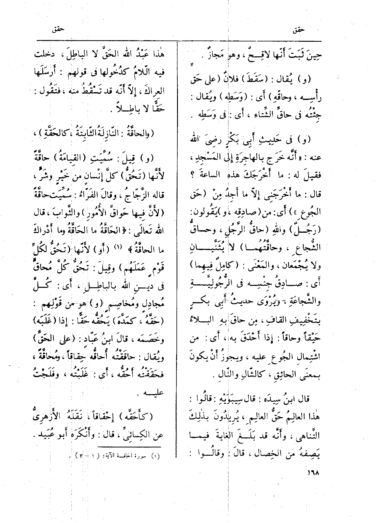 حِينَ ثَبَتَ أنّها لاقِح، وَهُوَ مَجازٌ. ويُقال: سَقَطَ فلَان على {حَق رأِسه،} وحاقّهِ أَي: وَسَطِه ويُقال: جِئتُه فِي {حاقِّ الشِّتاءَ، أَي: فِي وَسَطِه. وَفِي حَدِيثِ أبِي بَكْرٍ رضِي الله عَنهُ: أنَّه خَرَج بالهاجِرَةِ إِلَى المَسْجِدِ، فقيلَ لَهُ: مَا أَخْرَجَكَ هَذِه الساعةَ قَالَ: مَا أَخْرَجَنِي إِلَّا مَا أَجِدُ مِنْ حَق الجُوعِ أَي: من صادِقِه، ويَقُولون: رَجل واللهِ} حاقُّ الرَّجُلِ، {وحاق الشُّجاع،} وحاقَّتُهُما لَا يثَنَّيانِ وَلَا يُجْمَعان، والمَعْنَى: كامِلٌ فِيهِما أَي: صادِقُ جِنْسِه فِي الرجولِيَّة والشجاعَةِ، ويُرْوَى حَدِيث أَبي بكرٍ بتَخفِيفِ القافِ، مِن حاقَ بهِ البلاءُ حَيْقاً وحاقاً: إِذا أحْدَقَ بِهِ، أَي: من اشتِمالِ الجُوع عَلَيْهِ، وَيجوز أنْ يكونَ بمعنَى الحائِقِ، كالشّال والنّالِ. قَالَ ابْن سيدَه: قَالَ سِيبَوَيْهِ: قالُوا: هَذَا العالِمُ {حَقُّ العالِم، يُرِيدُون بذلِكَ التَّناهي، وأَنه قد بَلَغ الغايةَ فِيمَا يصِفهُ من الْخِصَال، قالَ: وقالُوا: هَذَا عَبْدُ الله} الحَقَّ لَا الباطِلَ، دخلت فِيهِ الّلامُ كدُخُولها فِي قَوْلهم: أرسَلَها العراك، إِلاّ أنّه قد تَسقُطُ مِنْهُ، فتَقُول: حَقَاً لَا باطِلاً. {والحاقةُ: النّازِلَةُ الثّابِتَةُ، كالحَقَّةِ، وقِيلَ: سُمِّيَتِ القِيامَةُ} حاقة لأنَّها {تَحُقُّ كلَّ إِنْسان من خَيْرٍ وشَرّ، قَالَه الزَّجّاجُ، وقالَ الفَرَّاءُ: سُمِّيت حاقَّةً لأنَّ فِيها} حَواقَّ الأمُورِ والثوابَ، قَالَ الله تَعالَى: {الحَاقَّة مَا الحَاقَّةُ وَمَا أدْراك مَا الحاقَةُ أَو لأنّها} تَحُقُّ لكل قَوْم عَمَلَهُم وقِيلَ: تَحُقًّ كُلَّ مُحاق فِي دينِ الله بالباطِلِ، أَي: كُل مُجادِلٍ ومخاصِمٍ وَهُوَ من قَوْلِهم: {حَقَّهُ، كمَدَّهَ يَحُقه حَقّاً: إِذا غَلَبَه وخَصَمَه، قالَ ابنُ عَباد: على الحَق ويُقال:} حاقَقْته {أحاقُّه} حِقاقاً، {ومُحاقةً،} فحَققته {أحقُّه، أَي: غَلَبْتُه، وفَلَجتُ عَلَيْهِ.} كأحَقَّه! إِحْقاقاً، نَقَلَهُ الأزهرِيُّ عَن الكسِائيِّ، قَالَ: وأنْكَرَه أَبو عُبَيد.