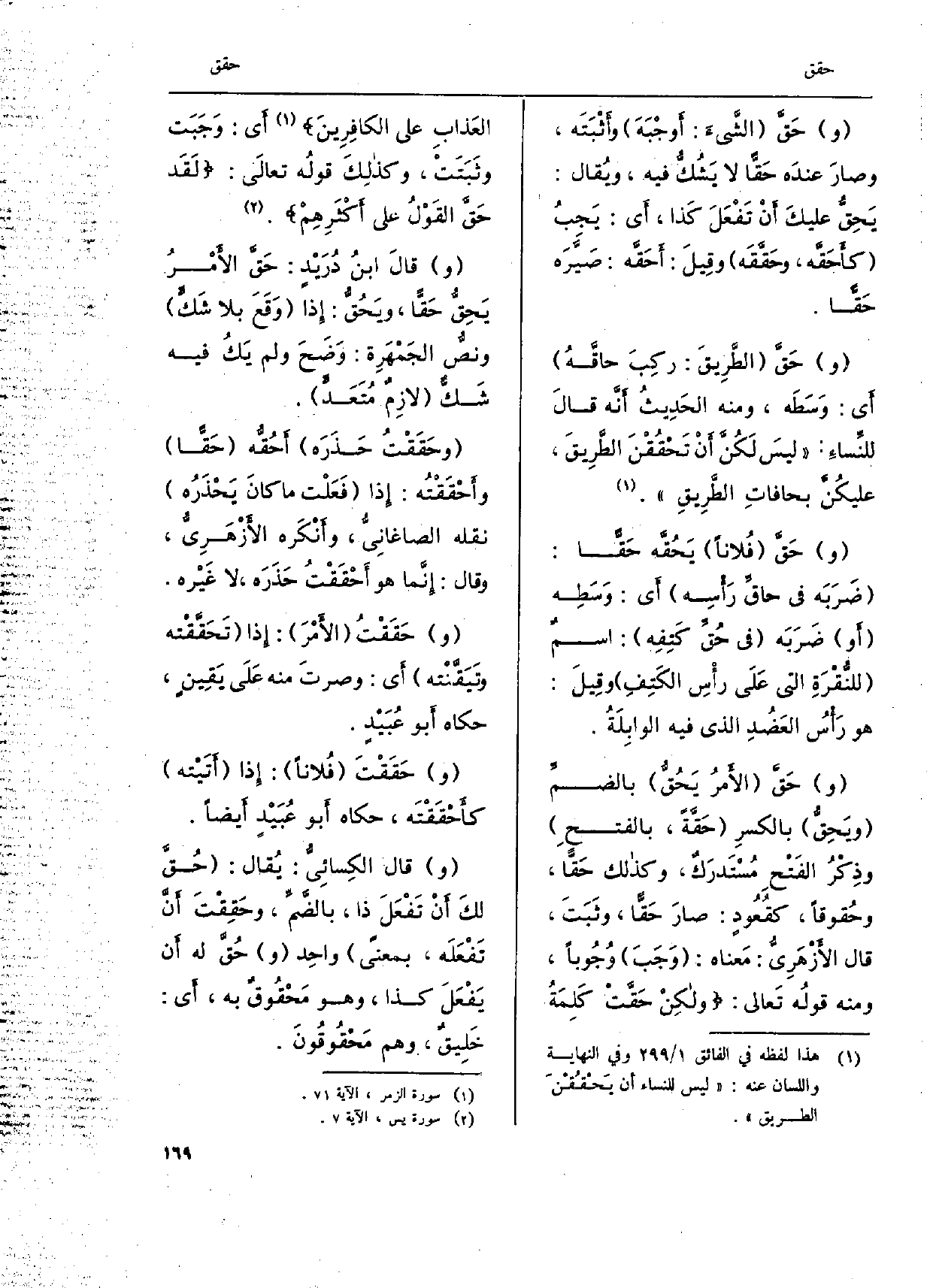 (و) {حَقَّ الشّيءَ: أَوجْبَهَ وأثبَتَه، وصارَ عندَه} حَقاً لَا يَشُك فِيهِ، ويُقال: {يَحِقّ عليكَ أَنْ تَفْعَلَ كَذا، أَي: يَجبُ} كأحَقَّه، {وحَققَه وقِيلَ:} أحَقَّه: صَيًّرَه {حَقاً. (و) } حَق الطرِيقَ: ركِبَ حاقهُ أَي: وَسَطَه، وَمِنْه الحَدِيثُ أَنه قالَ للنساءَ: ليسَ لَكُنَّ أنْ {تَحْقُقْنَ الطَّرِيقَ، عليكُن بحافاتِ الطَّرِيقِ. وحَق فُلاناً} يَحقَّه {حَقًّا: ضَرَبَه فِي} حاقِّ رَأسِه أَي: وَسَطِه أَو ضَرَبَه فِي {حُقِّ كَتِفِه: اسْم للنُّقْرَةِ الَّتِي عَلَى رأْسِ الكَتِفِ وقِيل: هُوَ رَأس العَضُدِ الَّذِي)