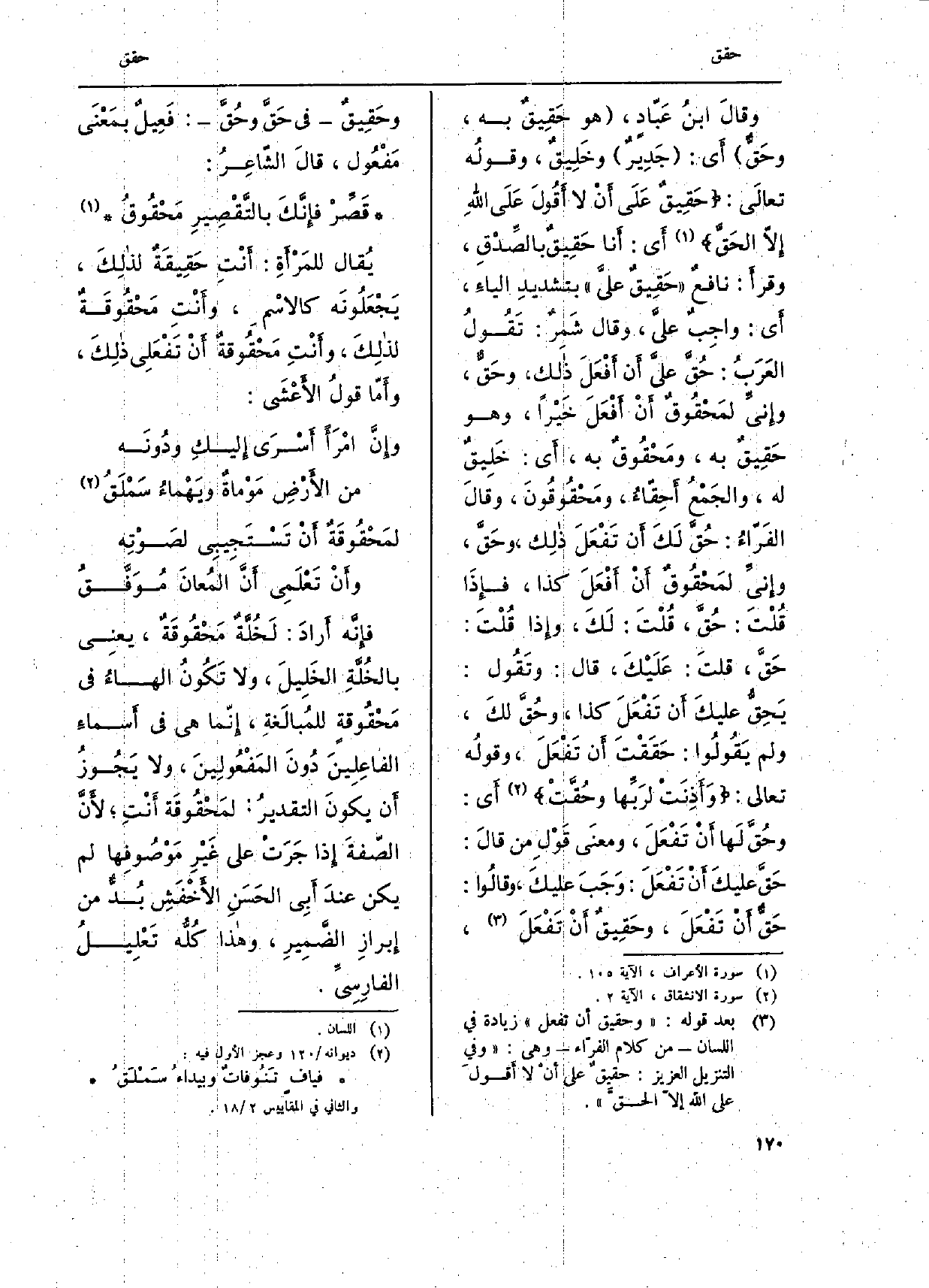وَقَالَ ابْن عَبّاد، هُوَ {حَقِيقٌ بِهِ،} وحَقٌّ أَي: جَدِيرٌ وخَلِيقٌ، وَقَوله تعالَى: حَقِيقٌ عَلَى أَنْ لَا أَقُولَ عَلَى اللهِ إِلاّ الحَقَّ أَي: أَنا حَقِيقٌ بالصِّدْقِ، وَقَرَأَ: نافعٌ حَقِيقٌ عليَّ بتشديدِ الياءَ، أَي: واجِبٌ عليَّ، وَقَالَ شَمرٌ: تَقُول العَرَبُ: {حُق عليَّ أَن أَفْعَلَ ذَلك، وحَق، وإِني لمَحقُوقٌ أنْ أَفْعَلَ خَيْراً، وَهُوَ} حَقِيق بِهِ، {ومَحْقُوقٌ بِهِ، أَي: خَلِيقٌ لَهُ، والجَمعُ} أَحِقّاءُ، {ومَحْقُوقُونَ، وَقَالَ الفَراء:} حُقَّ لَكَ أَن تَفْعَلَ ذلِك، {وحَقَّ، وإِني} لمَحقُوقٌ أنْ أَفْعَلَ كَذَا، فإِذَا قُلْتَ: {حُقَّ، قلْتَ: لَكَ، وَإِذا قُلْتَ:} حَقَّ، قلتَ: عَلَيْكَ، قَالَ: وتَقول: {يَحِقُّ عليكَ أَن تَفْعَلَ كَذَا، وحُق لكَ، وَلم يَقُولُوا:} حَقَقْتَ أَن تَفْعَلَ، وَقَوله تَعَالَى: وَأَذِنَتْ لرَبِّها {وحُقَّتْ أَي:} وحُقّ لَها أَنْ تَفْعَلَ، ومعنَى قَولِ من قَالَ: {حَقَّ عليكَ أنْ تَفْعَلَ: وَجَبَ عليكَ، وقالُوا: حَق أَنْ تَفعَلَ،} وحَقيقٌ أَنْ تَفْعَلَ، وحقِيق فِي {حَقَّ} وحُقَّ: فَعِيل بمَعْنَى مَفْعُول، قالَ الشّاعِر: قَصِّر فإنَّكَ بالتَّقْصِيرِ {مَحْقُوقُ يُقال للمَرْأَةِ: أنْتِ} حَقِيقَةٌ لذلِكَ، يَجعَلونَه كالاسْم، وأنْتِ! مَحْقُوقةٌ لذلِك، وأنْتِ مَحْقُوقة أَنْ تَفْعَلِي ذلِكَ، وأمّا قولُ الأعْشَى: