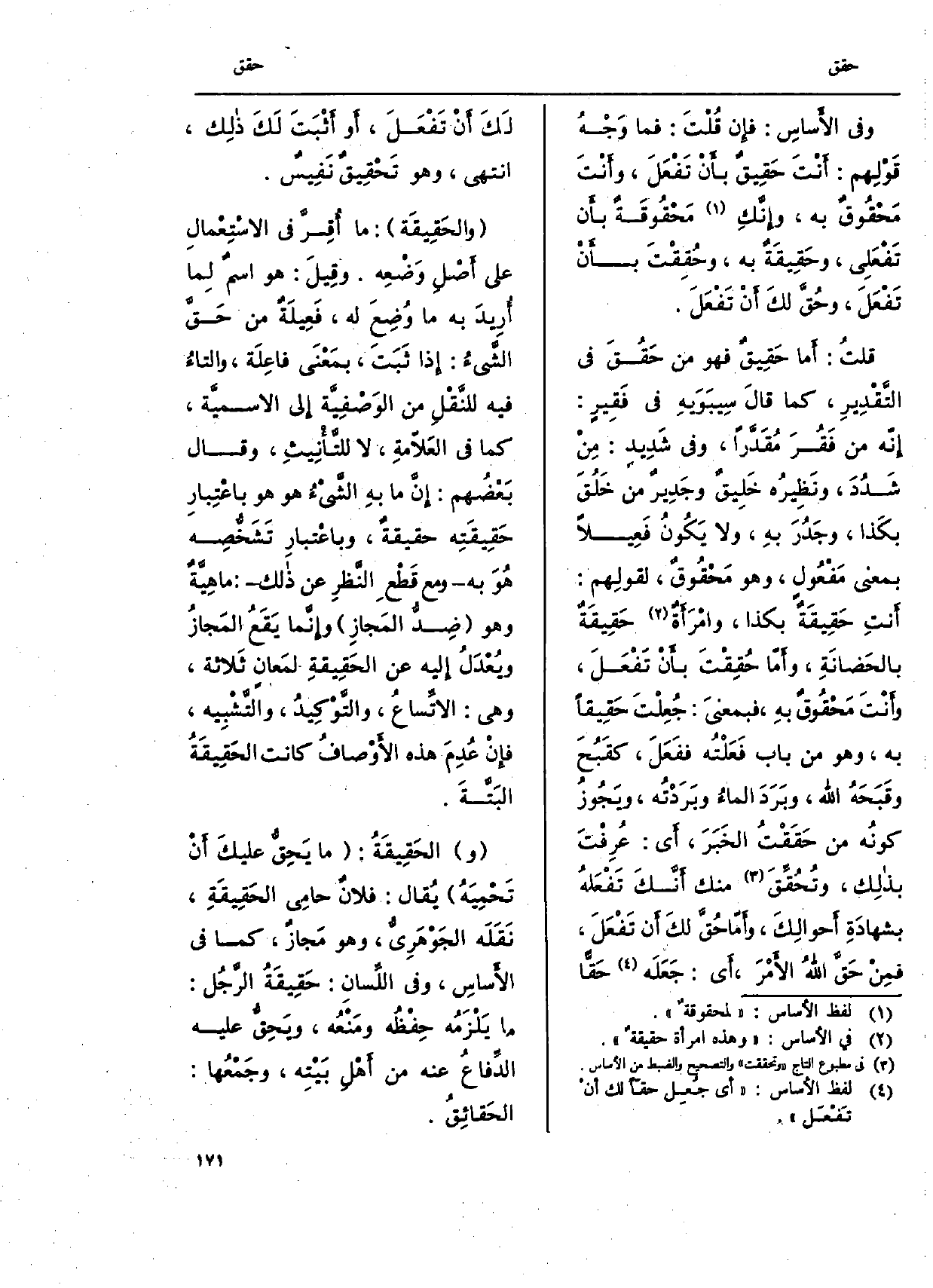 وَفِي الأساسِ: فَإِن قُلتَ: فَمَا وَجْهُ قولِهم: أنْتَ حَقِيقٌ بأنْ تَفْعَلَ، وأَنْت مَحقُوق بِهِ، وإنكِ مَحقُوقَة بِأَن تفعَلِي، وحَقِيقَة بِهِ، {وحقِقْتَ بأنْ تَفعَلَ،} وحُقّ لكَ أَن تَفْعَلَ. قلتُ: أما حَقِيقٌ فَهُوَ من حَققَ فِي التقديرِ، كَمَا قالَ سِيبَوَيهِ فِي فَقِيرٍ: إنّه من فَقُرَ مُقَدراً، وَفِي شَدِيد: مِن شَدُدَ، ونَظِيرُه خَلِيقٌ وجَدِير من خَلُقَ بكَذا، وجَدرَ بهِ، وَلَا يَكُون فَعِيلاً بِمَعْنى مَفْعُول، وَهُوَ مَحقُوق، لقولِهم: أنتِ حَقيقَة بِكَذَا، وامْرَأَة حَقِيقَةٌ بالحَضانَةِ، وأَمّا حُقِقتَ بأنْ تَفعَلَ، وأَنْتَ {مَحقُوقٌ بهِ، فبمعنىَ: جُعِلْتَ} حَقِيقاً بِهِ، وَهُوَ من بَاب فَعَلْتُه ففَعَلَ، كقَبحَ وقبَحَهُ الله، وبَرَدَ الماءُ وبَرَدتُه، ويَجُوز كوُنه من حَقَقتُ الخَبَرَ، أَي: عُرِفْتَ بذلِك، {وتُحُققَ مِنْك أَنَّكَ تَفعلهُ بشهادَةِ أَحوالِكَ، وأَمّا} حُقَّ لكَ أَن تَفْعَلَ، فمِن {حَق اللهُ الأمرَ، أَي: جَعَلَه حَقّاً لَك أَنْ تَفْعَلَ، أَو أَثْبَتَ لَكَ ذلِك، انْتهى، وَهُوَ تَحقِيق نَفِيس.} والحَقِيقَة: مَا أقِر فِي الاستِعْمالِ على أَصْل وَضْعِه. وقِيلَ: هُوَ اسمٌ لِما أريدَ بِهِ مَا وُضِعَ لَهُ، فَعِيلَة من {حَق الشًّيءُ: إِذا ثَبَتَ، بمَعْنَى فاعِلَة، والتاءُ فِيهِ للنَّقْل من الوَصفية إِلَى الاسميَّة، كَمَا فِي العَلاّمةِ، لَا للتأنِيثِ، وَقَالَ بَعضُهم: إِن مَا بهِ الشَّيْء هُوَ هُوَ باعْتِبارِ} حَقِيقَتِه {حقيقةٌ، وباعْتبارِ تَشَخصِه هُوَ بِهِ وَمَعَ قَطع النّظر عَن ذَلِك: ماهِية وَهُوَ ضِد المَجازِ وَإِنَّمَا يَقَعُ المَجازُ ويُعدَلُ إِلَيْهِ عَن الحَقِيقةِ لمَعانٍ ثَلاثة، وَهِي: الاتساعُ، والتوكِيدُ، والتشبِيه، فإنْ عُدِمَ هَذِه الأوصافُ كَانَت الحَقِيقَةُ البَتةَ. (و) } الحَقِيقَةُ: مَا! يحِقُّ عليكَ أنْ تَحمِيَهُ يُقال: فلانٌ حامِي الحَقِيقَةِ، نَقَلَه الجَوهَرِي، وَهُوَ مَجاز، كَمَا فِي الأساسِ، وَفِي اللسانِ: حَقِيقَةُ الرجل: مَا يَلزَمُه حِفظُه ومَنْعُه، ويَحِق عَلَيْهِ الدّفاعُ عَنهُ من أَهل بَيتِه، وجَمعُها: الحَقائِقُ.