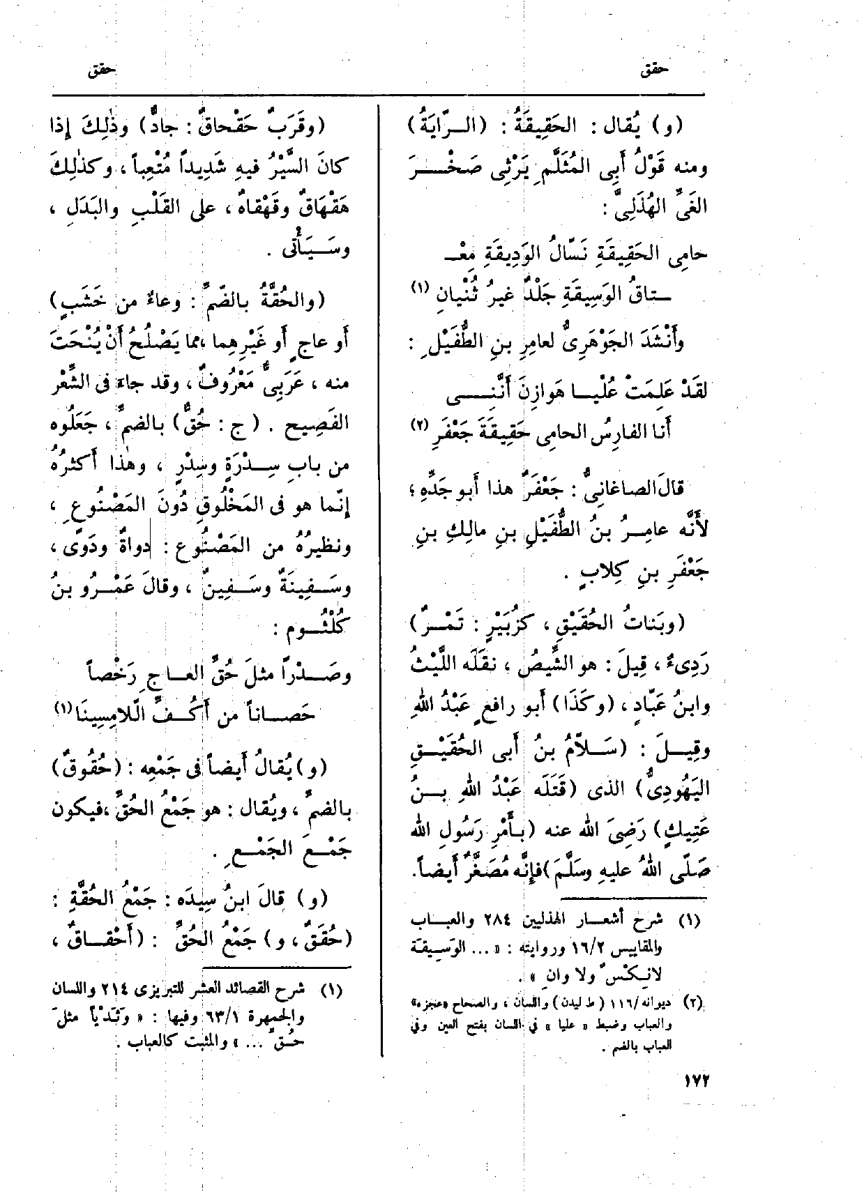ويُقال: الحَقِيقَةُ: الرّايَة وَمِنْه قولُ أَبي المُثَلَّمِ يَرثِي صَخْرَ الغَيِّ الهذَليّ: