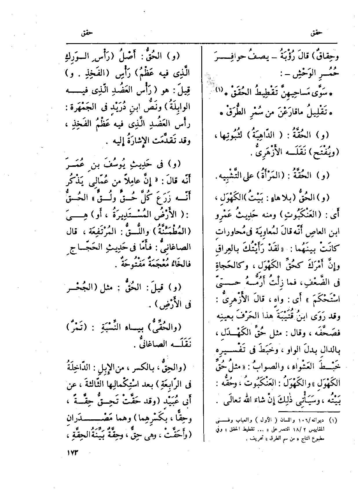 والحُق: أَصل رَأس الوَرِكِ الَّذِي فِيهِ عَظمُ رَأسِ الفَخِذِ. وقِيلَ: هُوَ رَأس العَضُدِ الّذِي فِيهِ الوابِلَةُ ونَص ابنِ درَيْد فِي الجَمْهَرة: رَأس العَضُدِ الَّذِي فِيهِ عَظْمُ الفَخِذِ، وَقد تَقدمت الإشارَةُ إِلَيْهِ. وَفِي حَدِيثِ يُوسُفَ بن عُمَرَ أَنّه قالَ: إِن عامِلاً من عُمّالي يذْكُر أَنّه زَرَعَ كُلَّ حُقّ ولُق الْحق: الأرضُ المُسْتَدِيرَةُ، أَو هِي المُطمَئنَّة واللُّق: المُرْتَفِعَة، قَالَ الصاغانِي: فَأَما فِي حَدِيثِ الحَجّاج فالخَاءُ مُعْجَمَةٌ مفْتُوحَة. وقيلَ: الحُقُّ: مثل الجُحر فِي الأرْضِ. {- والحُقيُّ بياء النسبَةِ: تَمْرٌ نَقَلَه الصَّاغَانِي.} والحِق، بِالْكَسْرِ، من الإِبِل: الدّاخِلَةُ فِي الرّابِعَةِ بعد اسْتِكْمالِها الثّالثةَ، عَن أَبي عُبَيْد وَقد {حَقت} تَحِق {حِقة،} وحِقاً، بكَسْرِهِما وهما مَصدَرانِ {وأَحَقَّتْ، وَهِي} حِق، {وحِقة بَيِّنَةُ} الحِقَّةِ،