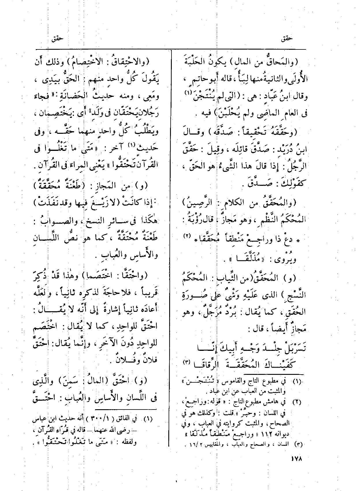 } والاحْتِقاقُ: الاخْتِصامُ وَذَلِكَ أَن يقولَ كُلُّ وَاحِد مِنْهُم: {الحَقُّ بيَدِي، ومَعِي، وَمِنْه حديثُ الحضانَةِ: فجاءَ رَجُلانِ} يَحْتَقّان فِي وَلَدِ أَي: تختصِان، ويطْلُبُ كُلُّ واحدٍ مِنْهَا {حَقَّه، وَفِي حَديثٍ آخر: مَتى مَا تَغْلُوا فِي القُرآن} تَحْتَقُّوا يَعْنِي المِراءَ فِي القُرآنِ. وَمن المَجازِ: طَعْنَةٌ {محَققَةٌ: إِذا كانَتْ لَا زَيْغَ فِيها وَقد نَفَذَتْ هكَذا فِي سائرِ النّسخ، والصوابُ: طَعْنَةٌ مُحْتَقَّةٌ، كَمَا هُوَ نصُّ اللِّسانِ والأَساس والعُبابِ.} واحْتَقَّا: اختصَما وَهَذَا قَدْ ذُكِرَ قَرِيبا، فَلَا حاجَةَ لذكرِه ثانِياً، ولَعَلَّه أَعادَه ثانِياً إِشارةً إِلى أَنّه لَا يُقالُ:! احْتَقَّ للواحِدِ، كَمَا لَا يُقال: اخْتَصَم للواحِدِ دُون الآخَرِ، وإِنَّما يُقال: احْتَقَّ فلَان وفُلانٌ. واحْتَقَّ المَال: سَمِنَ والَّذِي فِي اللِّسَان والأَساسِ والعُباب: احْتَقَّ
