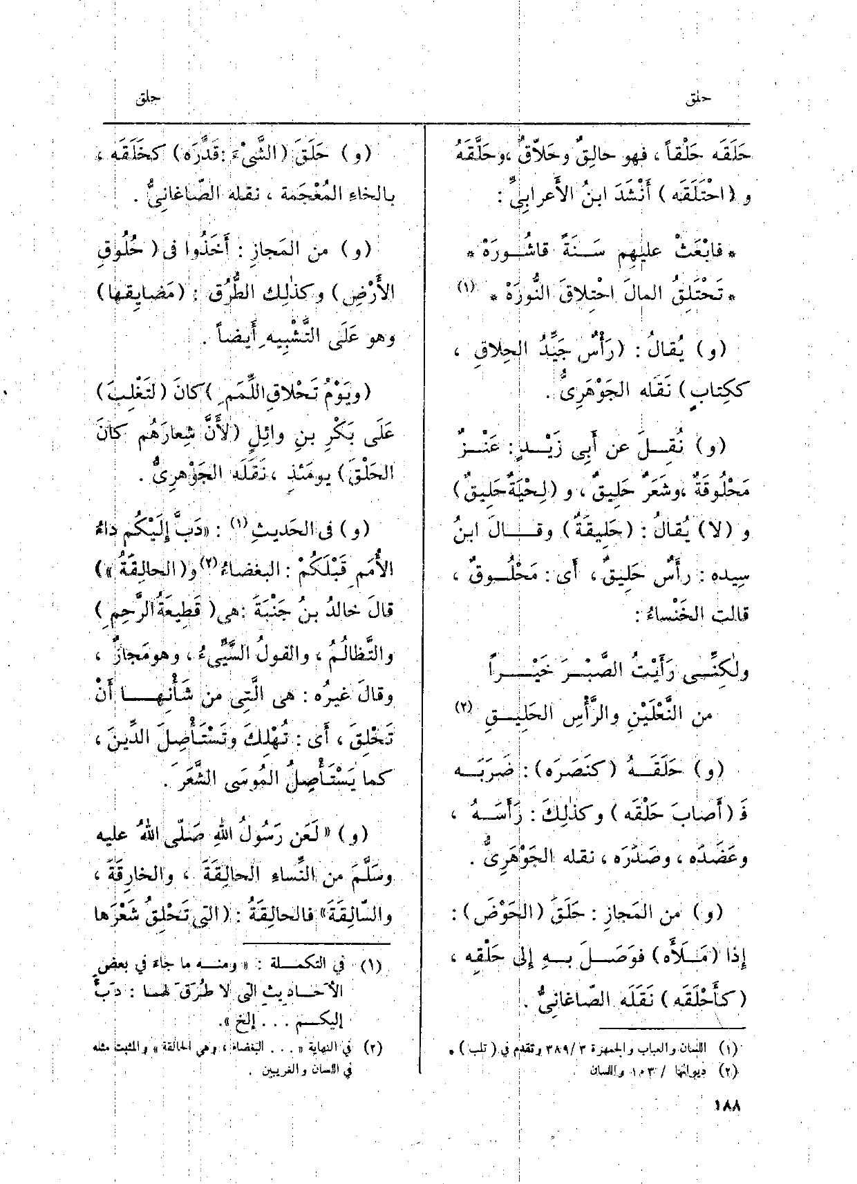 وحلَقَهُ كنَصَره. ضربه فأصابٌ حَلْقَه وكذلِكَ: رَأسَهُ، وعَضدَه، وصَدَرَه، نَقله الجَوْهَرِيّ. وَمن المَجازِ: حَلَقَ الحَوْضَ: إِذا مَلأه فوَصَلَ بهِ إِلى حَلقه، كأَحْلَقَه. نَقله الصّاغانِيُّ: وحَلَقَ الشَّيْء: قَدره كخلَقَه، بالخاءَ المعجَمة، نَقله الصاغانِي. وَمن الْمجَاز: أَخَذوا فِي حلوقِ الأَرضِ وكذلِك الطُّوق: مَضايِقها وَهُوَ عَلَى التَّشبِيهَ أَيضاً. ويَوْمُ تَحلاقِ اللمَمَ كانَ لتَغلب عَلى بكرِ بن وائِل لأَنَّ شعارَهم كَانَ الحَلقَ يومَئذِ، نَقله الْجَوْهَرِي. وَفِي الحَديثِ: دَبَّ إِلَيكُم دَاء الأمَم قَبْلَكُمْ: الْبغضَاء والحالقة قالَ خالدُ بنُ جَنْبَةَ: هِيَ قَطيعَةُ الرحِم والتَّظالمُ، والفولُ السَّيئ، وَهُوَ مجَاز، وقالَ غيرُه: هِيَ الَّتِي من شَأْنهَا أنْ تحلق، أَي: تهْلِكَ وتَستَأْصِلَ الدينَ، كَمَا يَستّأصِل الموسَى الشَعَرَ.