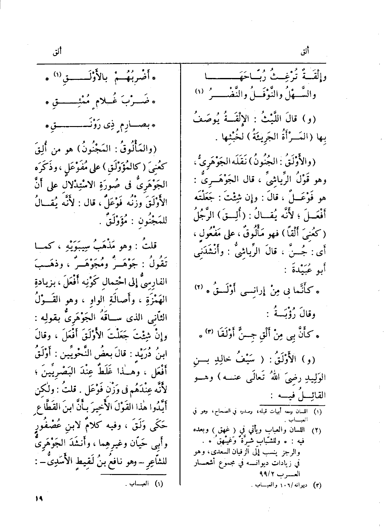 وقالَ اللَّيْثُ:} الإِلْقَةُ يُوصَفُ بهَا المَرْأَةُ الجَريئَةُ لخُبْثِها. {والأَوْلَقُ: الجُنُون نَقَلَه الجَوْهَرِيُّ وَهُوَ قَوْلُ الرِّياشي، قَالَ الجَوْهَرِي: هُوَ فَوْعَل قالَ: وإِن شئْتَ: جَعَلتَه أَفْعَلَ، لأَنه يُقالُ:} أُلِقَ الرَجُلُ كعُنِىَ {أَلْقَاً فَهُوَ} مَألُوق، على مَفْعولٍ، أَي: جنَّ، قالَ الرِّياشِيّ: وأَنْشَدَنِي أَبو عُبَيْدة: كأَنَّما بِي مِنْ إراني {أَولَقُ وقالَ رُؤْبَةُ: كأَنَّ بِي مِنْ} أَلقِ جِنٍّ {أَوْلقا (و) } الأَوْلَقُ: سَيْفُ خالِدِ بنِ الوَلِيدِ رضِىَ اللهُ تَعالَى عَنهُ وَهُوَ القائِلُ فِيهِ: