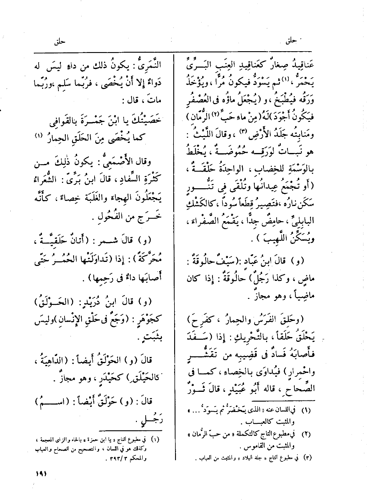 عَناقِيدُ صِغارٌ كعَناقِيدِ العِنَب البَريِّ يَحْمَرُّ، ثمَّ يَسْوَد فيكونُ مُراً، ويُؤْخَذ وَرَقُه فيُطْبَخُ، ويُجْعَلُ ماؤُه فِي العُصْفُرِ فيَكُونُ) أَجْوَدَ لَهُ مِنْ ماءَ حَبِّ الرُّمّانِ ومَنابِتُه جَلَدُ الأَرْضِ، وقالَ اللَّيْثُ: هُوَ نَباتٌ لوَرَقِه حُمُوضَةٌ، يُخلَطُ بالوَسْمَةِ للخِضابِ، الواحِدَةُ حَلْقَةٌ، أَو تُجْمَعُ عِيدانُها وتُلْقَى فِي تَنورٍ سَكَن نارُه، فتَصِيرُ قِطَعاً سُوداً، كالكَشْكِ البابِليِّ، حامِضٌ جِدّاً، يَقْمَعُ الصَّفْراءَ، ويُسَكًّنُ اللَّهِيبَ. وقالَ ابنُ عَبّادِ: سَيْفٌ حالُوقَةٌ: ماضٍ، وَكَذَا رَجلٌ حَالُوقَةٌ: إِذا كَانَ ماضِياً، وَهُوَ مجازٌ. وحَلِقَ الفَرَسُ والحِمارُ، كفَرِحَ يَحْلَقُ حَلَقاً، بالتَّحْرِيكِ: إِذا سَفَدَ فأَصابَهُ فَسادٌ فِي قَضِيبِه من تَقَشُّرٍ واحْمِرارٍ فيُداوَى بالخِصاء، كَمَا فِي الصِّحاح، قَالَه أَبُو عُبَيْدٍ، قالَ ثَوْر النّمَرِي: يكونُ ذَلِك من داءِ ليسَ لَهُ دَواءٌ إِلا أَنْ يُخْصَى، فرُبّما سَلِم، ورُبّما ماتَ، قَالَ: