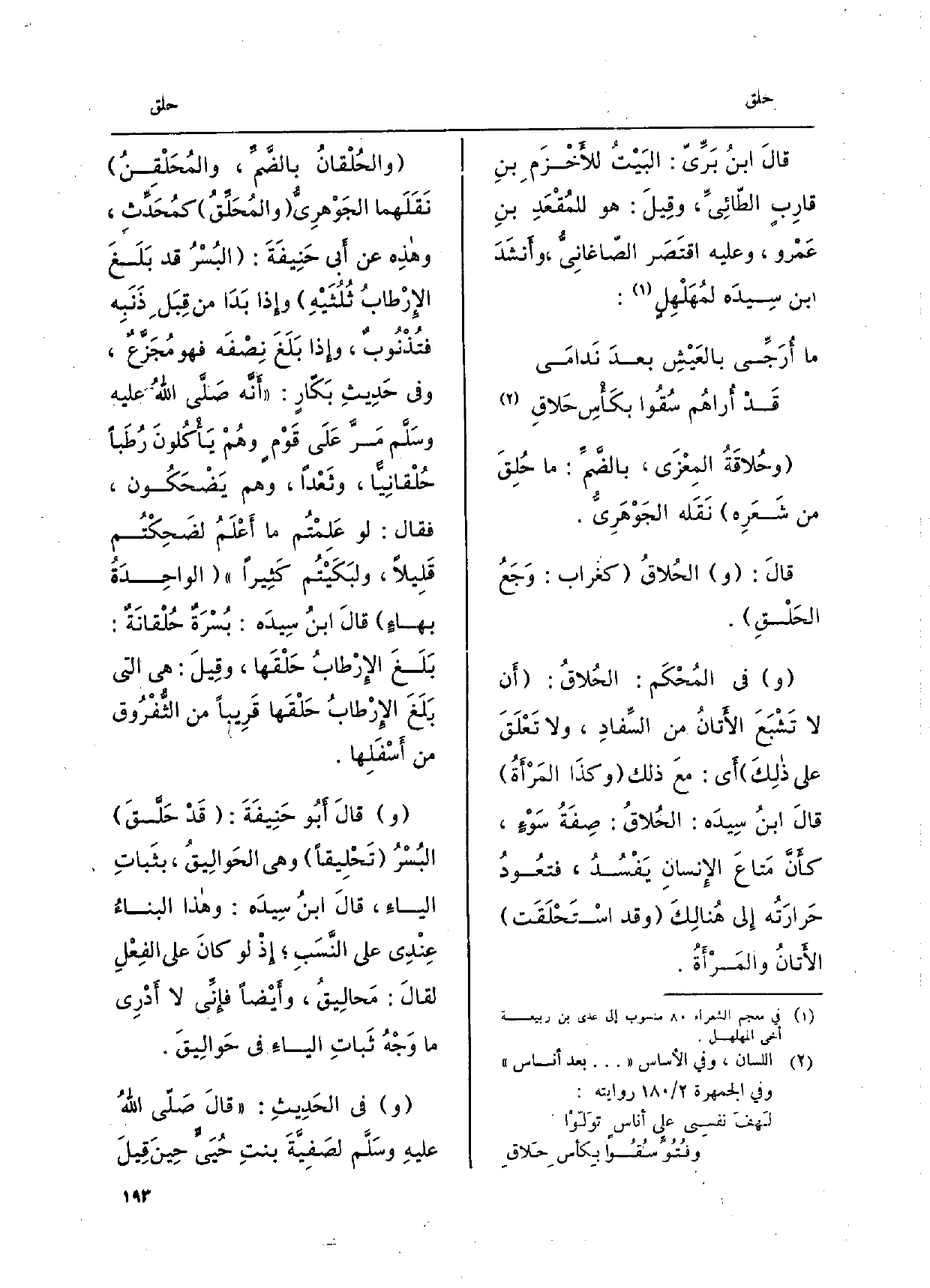 وحُلاقةُ المِعْزَى، بالضَّمِّ: مَا حُلِقَ من شَعرِه نَقله الجَوهَرِي. قالَ: والحلاقُ كغراب: وَجَعُ الحَلْقِ. وَفِي المُحْكَم: الحُلاقُ: أَن لَا تَشْبَعَ الأَتانُ من السِّفادِ، وَلَا تَعْلَقَ على ذلِكَ أَي: مَعَ ذَلِك وكذَا المَرْأَةُ قالَ ابنُ سِيدَه: الحُلاقُ: صِفَةُ سَوْء، كأَنَّ مَتاعَ الإِنسانِ يفْسُدُ، فتعُودُ حَرارَتُه إِلى هُنالكَ وَقد اسْتحْلَقَت الأتانُ والمرْأَةُ. والحُلْقانُ بالضَّمِّ، والمُحَلْقِنُ نَقَلَهما الجَوْهرِيُّ والمُحَلِّقُ كمُحَدِّثِ، وهذِه عَن أَبي حَنِيفَةَ: البُسْرُ قد بَلَغَ الإِرْطابُ ثُلُثَيْهِ وإِذا بَدَا من قِبَل ذَنَبِه فتُذْنُوب، وإِذا بَلَغَ نِصْفَه فَهُوَ مُجَزع، وَفِي حَدِيثِ بَكّارٍ: أَنَّه صَلَّى اللهُ عَلَيْهِ وسَلَّم مَرَّ عَلَى قَوْم وهُمْ يَأكُلونَ رُطَباً حُلْقانيّاً، وثَعْداً، وهم يَضْحَكُون، فَقَالَ: لَو عَلِمْتُم مَا أَعْلَمُ لضَحِكْتُم قَلِيلاً، ولبَكَيْتُم كَثِيراً الواحِدَة بهاءِ قالَ ابنُ سِيدَه: بُسْرَةٌ حُلْقانَةٌ: بَلَغَ الإِرْطابُ حَلْقَها، وقِيلَ: هِيَ الَّتِي بَلغ الإِرْطابُ حَلْقَها قَرِيباً من الثُّفْرُوق من أَسْفَلِها. وقالَ أَبو حَنِيفَةَ: قَدْ حَلَّقَ البُسْرُ تَحْلِيقاً وَهِي الحَوالِيقُ، بثَباتِ الياءَ، قالَ ابنُ سِيدَه: وَهَذَا البناءُ عِنْدِي على النَّسَبِ، إِذْ لَو كانَ على الفِعْلِ لقالَ: مَحالِيقُ، وأَيْضاً فإِنِّي لَا أَدْرِي مَا وَجْهُ ثَباتِ الياءَ فِي حَوالِيقَ. وَفِي الحَدِيثِ: قالَ صَلّى اللهُ عليهِ وسَلَّم لصَفِيَّةَ بنتِ حُيَي حِينَ قِيلَ