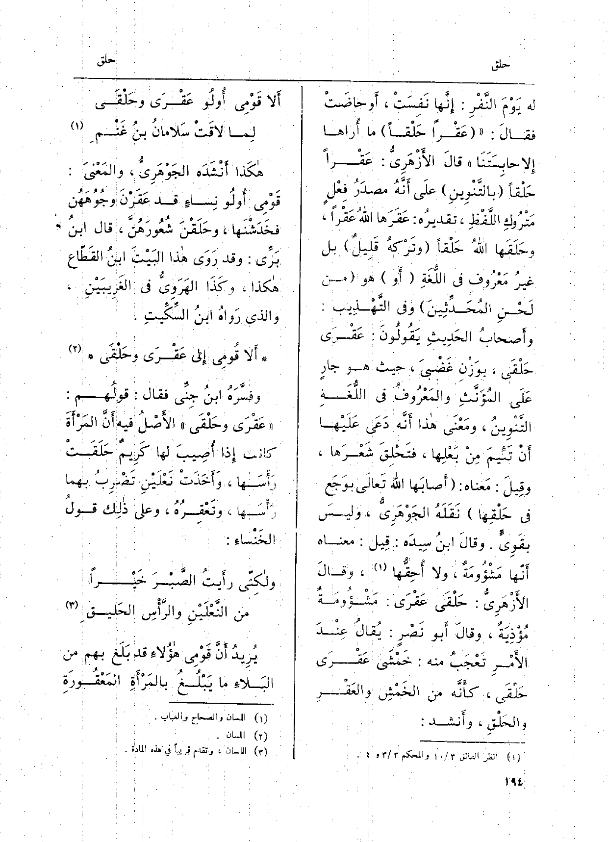 لَهُ يوْمَ النقرِ: إِنّها نَفِسَتْ، أَو حاضَت فقالَ: عقراً حَلْقاً مَا أُراها إِلا حابِسَتَنَا قالَ الأَزْهَرِيُّ: عقراً حَلْقاً بالتَّنْوِينِ علَى أَنَّهُ مصدَرُ فِعْلٍ مَتْرُوكِ اللَّفْظِ، تقديرُه: عَقَرَها اللهُ عَقْراً، وحَلَقَها اللهُ حَلْقاً وتَرْكهُ قَلِيل بل غيرُ مَعْرُوفِ فِي اللُّغَةِ أَو هُوَ من لَحْنِ المُحدِّثِينَ وَفِي التَّهْذِيب: وأصحابُ الحَدِيثِ يَقُولُونَ: عقْرَى حَلْقى، بوَزْنِ غَضْبىَ، حَيْثُ هُوَ جارٍ عَلَى المُؤَنَّثِ والمَعْرُوفُ فِي اللُّغَةِ التَّنْوِينُ، ومَعْنى هَذَا أَنَّه دَعى عَلَيْهَا أَنْ تَئَيمَ مِنْ بَعْلِها، فتَحْلِقَ شَعْرَها، وقِيلَ: مَعناه: أَصابَها الله تَعالَى بوَجَع فِي حَلْقِها نَقَلَهُ الجَوْهَرِيُّ، وليسَ بقَويّ. وقالَ ابنُ سيدَه: قِيل: مَعْنَاهُ أَنّها مَشْؤُومَة، وَلَا أُحقها، وقالَ الأَزْهَرِيّ: حَلْقَى عَقْرَى: مَشْؤومَةٌ مُؤْذِيَة، وقالَ أَبو نَصْرٍ: يُقالُ عِنْدَ الأَمْرِ تَعْجَبُ مِنْهُ: خَمْشَى عَقْرَى حلقى، كأَنَّه من الخَمْشِ والعَقر والحَلْقِ، وأَنشد:)