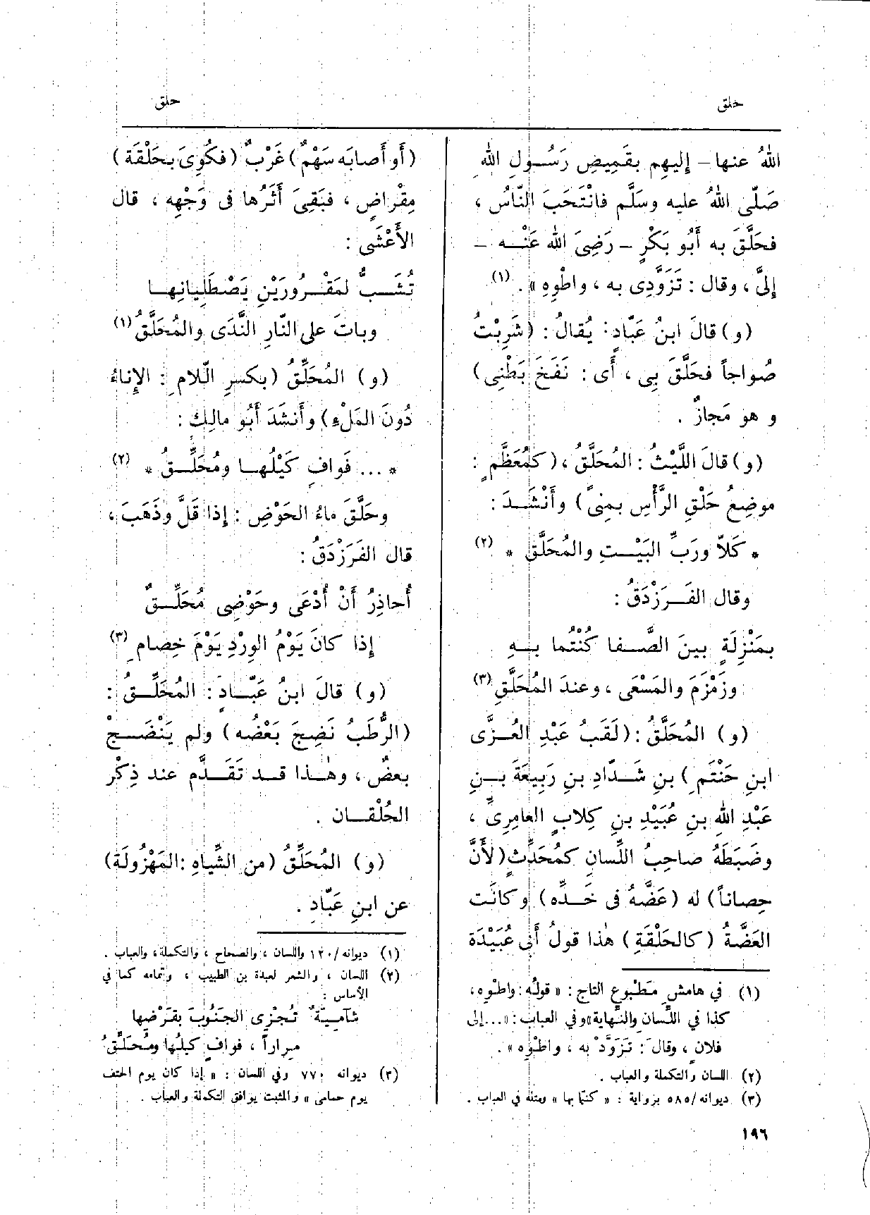 اللهُ عَنْهَا) إِليهِم بقَمِيصِ رَسول الله صَلّى الله عَلَيْهِ وسَلَّم فانْتَحَبَ النّاس، فحَلَّقَ بِهِ أَبُو بَكرٍ رَضِي الله عَنْه إِلي، وَقَالَ: تَزَوَّدِي بِهِ، واطْوِهِ. وقالَ ابنَ عَبّاد: يُقال: شَرِبتُ صُواجاً فحَلَّقَ بِي، أَي: نَفخ بَطْني وَهُوَ مَجازٌ. وقالَ الليْثُ: المُحَلَّقُ، كمُعَظَّمٍ: موضِعُ حَلْقِ الرَّأْسِ بمنى وأَنْشدَ: كَلاّ ورَبَ البَيْتِ والمُحَلَّق وَقَالَ الفَرَزْدَقُ: