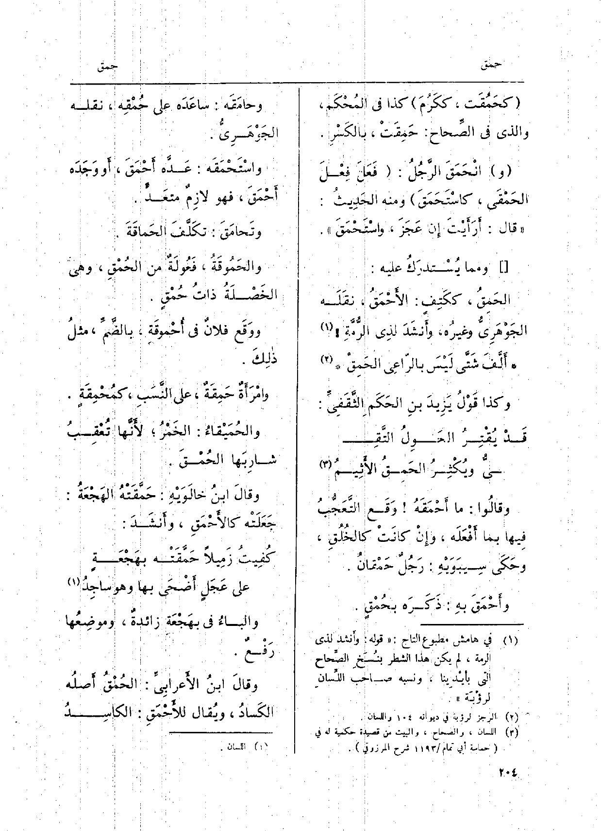 وقالُوا: مَا أَحمَقَهُ وَقع التَّعَجُّب فِيهَا بِمَا أَفْعله، وإِن كَانَت كالخلقِ، وحَكىَ سِيبَويهِ: رجل حمقان وأَحمقَ بهِ: ذكره بحمْقٍ. وحامقه: ساعَده على حمْقِه، نَقله الْجَوْهَرِي. واستَحْمقَه: عَده أحْمَقَ، أَو وَجَدَه أَحمَق، فَهُوَ لازِمٌ متعَد. وتَحامَقَ: تكَلف الحَماقَةَ. والحمُوقَةُ، فَعولَةٌ من الحُمْقِ، وَهِي الخَصْلةُ ذاتُ حُمْقٍ. ووَقَع فلَان فِي أحموقَةِ، بالضمِّ، مثلُ ذلكَ. وامْرَأَة حَمِقَةٌ، على النَّسبِ، كمُحْمِقَة. والحمَيقاءُ: الخمْرُ، لأَنَّها تُعقبُُ شارِبَها الحُمْقَ. وقالَ ابنُ خالَوَيْهِ: حَمَّقتهُ الهجعةُ: جعلته كالأحمق، وأَنشدَ: