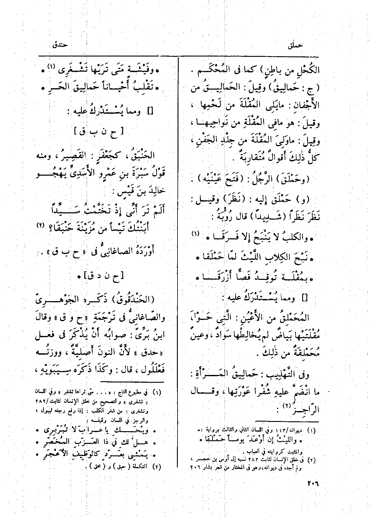 والكلبُ لَا يَنْبَحُ إِلا فَرَقَا نَبْحَ الكِلبِ اللَّيثَ لمّا حَملقا بمُقْلَة تُوقِد فَصا أَزْرَقَا وَمِمَّا يسْتَدرك عَلَيْهِ: المحملق من الْأَعْين الَّتِي حول مقلتيها بَيَاض لم يخالطها سَواد، وَعين محملقة من ذَلِك. وَفِي التَّهْذِيب حماليق الْمَرْأَة مَا انْضَمَّ شفرا عورتها وَقَالَ الراجز: وفيشة مَتى تريها تشغرى تَقْلِبُ أَحْياناً حَمالِيقَ الحَرِ