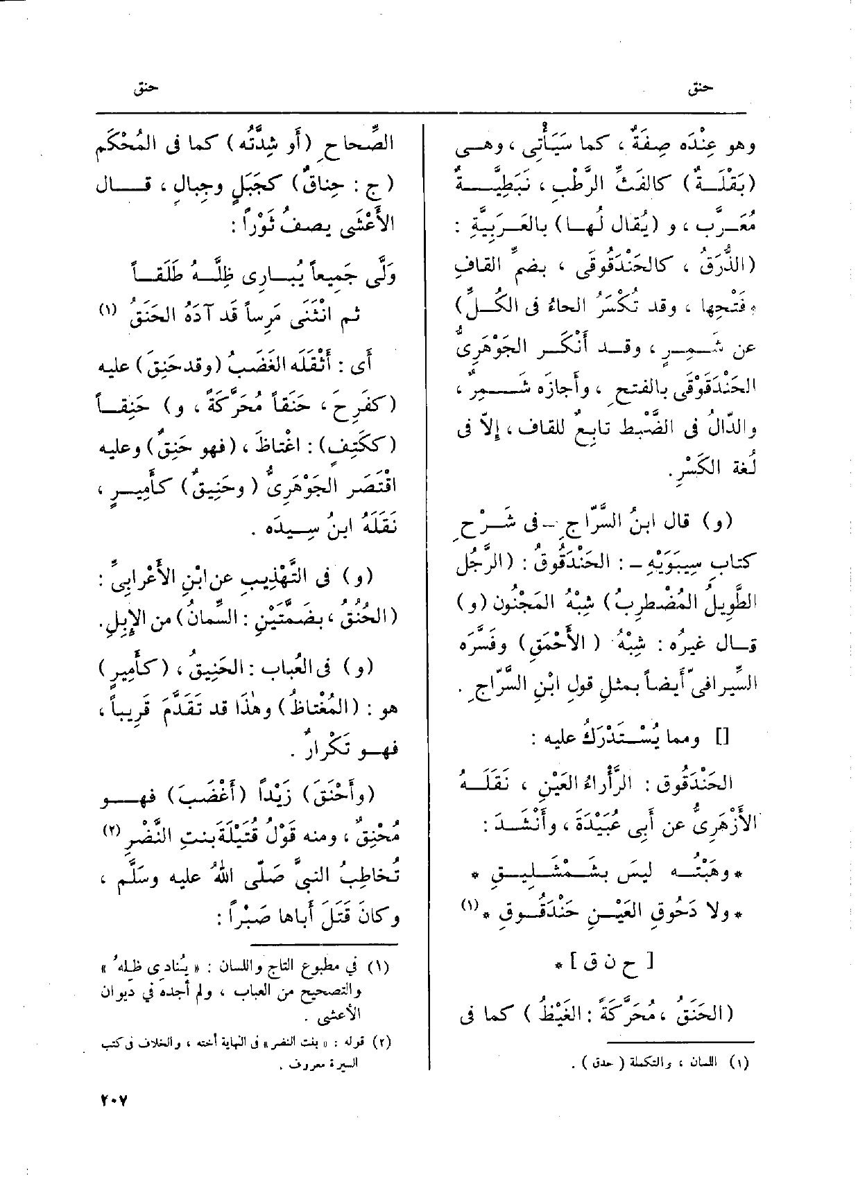 أَي: أَثْقَلَه الغَضَبُ وَقد حَنِقَ عَلَيْهِ كفَرِحَ، حَنَقاً مُحَرَّكَةً، وحَنِقاً ككَتفٍ: اغْتاظَ، فَهُوَ حَنِقٌ وَعَلِيهِ اقْتَصَر الجَوْهَرِيُّ وحَنِيقٌ كأَميرٍ، نَقَلَهُ ابنُ سِيدَه. وَفِي التَّهْذِيبِ عَن ابْنِ الأعْرابِيِّ: الحُنُقُ، بضَمَّتَيْنِ: السِّمانُ من الإِبِلِ. وَفِي العُباب: الحَنيِقُ، كأَمِيرٍ هُوَ: المُغْتاظُ وهذَا قد تَقَدَّمَ قَرِيباً، فَهُوَ تَكْرارٌ. وأَحْنَقَ زَيْداً أَغْضَبَ فَهُوَ مُحْنق، وَمِنْه قَوْلُ قُتَيْلَةَ بنتِ النَّضْرِ تُخاطِبُ النبيَّ صَلّى اللهُ عَلَيْهِ وسَلَّم، وكانَ قَتَلَ أَباها صَبْراً: