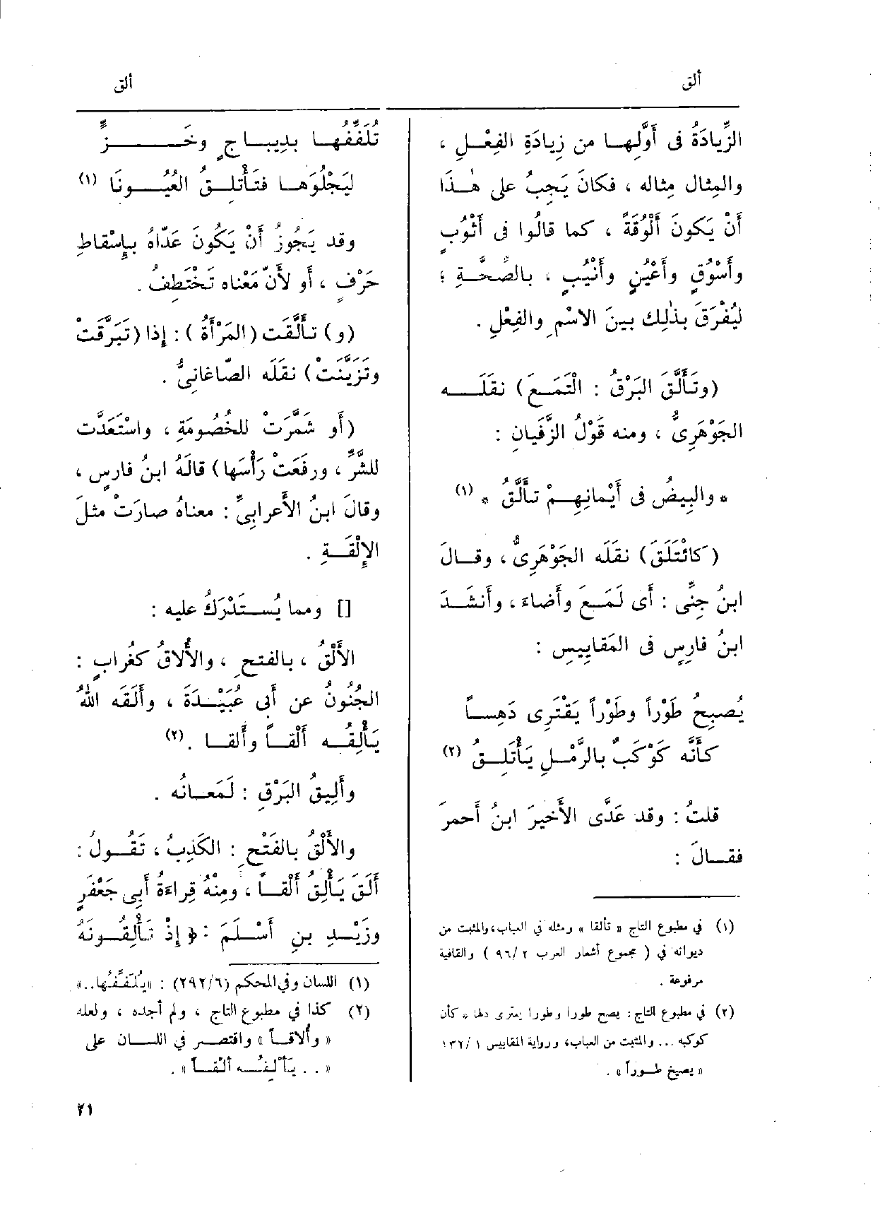 الزَيادَةُ فِي أَوَلِها من زِيادةِ الفعلِ، والمِثال مِثَاله فَكيف يجب على هَذَا أنَ يَكونَ {أَلوقَةَ، كَمَا قَالُوا فِي أَثوب وأَسوُق وأعْين وأَنيُبٍ، بالصحةِ، ليُفْرَقَ بذلِك بينَ الِاسْم والفعْلِ.} وتَأَلَّقَ البَرقُ: الْتَمَعَ نقَلَه الجَوهَويُّ، وَمِنْه قَول الزفَيانِ: والبِيض فِي أيمانِهِمْ {تأَلق} كائْتلَقَ نقَلَه الجَوْهري، وقالَ ابنُ جِنِّى: أَي لمعَ وأضاءَ، وأَنشد ابْن فَارس فِي المقاييس: