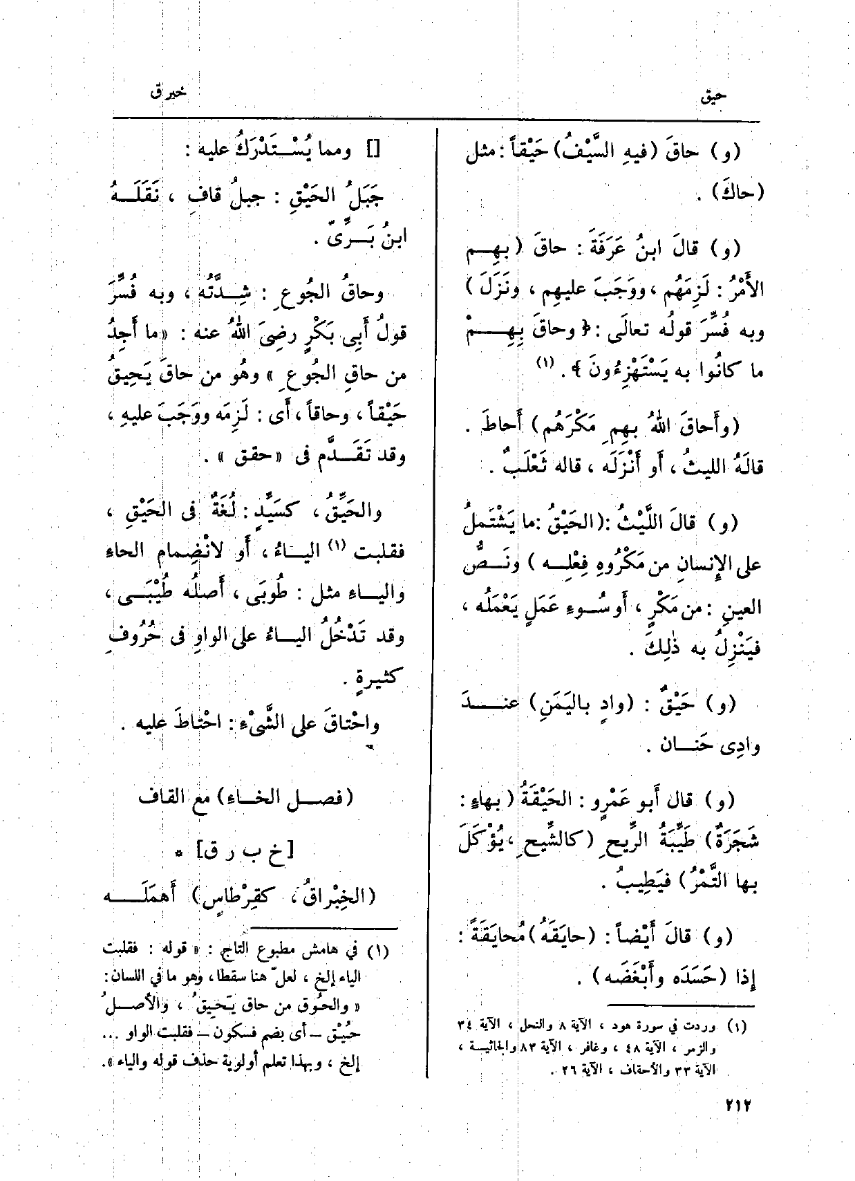 وَمِمَّا يسْتَدرك عَلَيْهِ: جَبَل} الحَيْقِ: جبلُ قافِ، نَقَلَهُ ابنُ بَرَيّ. {وحاقُ الْجُوع: شِدَّتُه، وَبِه فسِّرَ قولُ أَبِي بَكْر رضِي اللهُ عَنهُ: مَا أَجِدُ من} حاقِ الجُوع وهُو من حاقَ {يَحِيقُ} حَيْقاً، {وحاقاً، أَي: لَزِمَه ووَجَبَ عليهِ، وَقد تَقَدَّم فِي حقق.} والحَيِّقُ، كسَيِّدٍ: لغَةٌ فِي الحَيْقِ، فقلبت الياءُ، أَو لانْضِمام الحاءَ وَالْيَاء مثل: طُوبَى، أَصلُه طيْبَى، وَقد تَدْخُل الياءُ على الواوِ فِي حُرُوف كثيرةٍ.! واحْتاقَ على الشَّيءَ: احْتاطَ عَلَيْهِ.