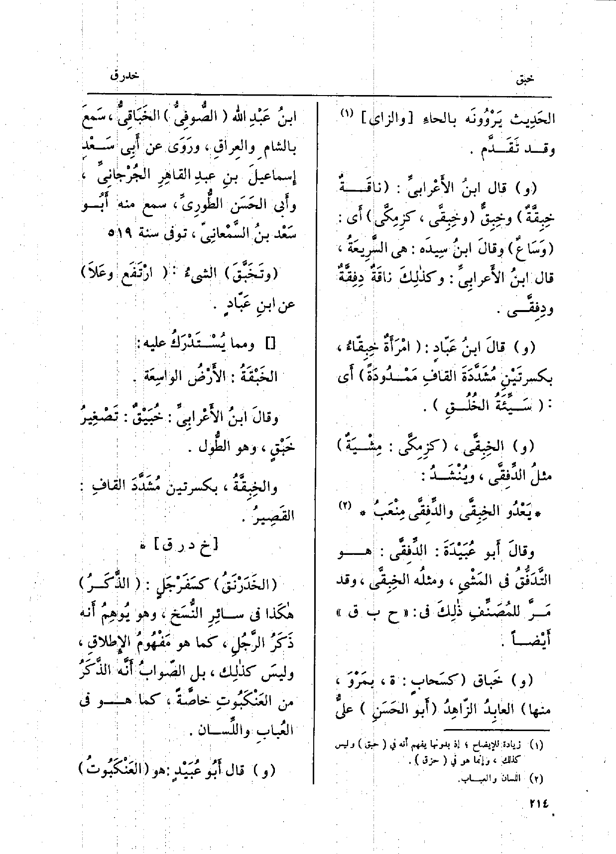الحَدِيث يَرْوُونَه بالحاءِ وَالزَّاي، وَقد تَقَدَّم. وَقَالَ ابنُ الأَعْرابيَ: ناقَة خِبِقَّةٌ وخِبِقّ وخِبِقَّى، كزِمِكَّى أَي: وَسَاعٌ وقالَ ابنُ سِيدَه: هِيَ السَّرِيعَةُ، قَالَ ابنُ الأَعرابِيِّ: وكذلِكَ ناقَةٌ دِفِقَّةٌ ودِفِقى. وقالَ ابْن عَبّادٍ: امْرَأَةٌ خِبِقّاءُ، بكسرتَيْنِ مُشَدَّدَةَ القافِ مَمْدودَةً أَي: سَيِّئَةُ الخلُقِ. والخِبِقَّى، كزِمِكَّى: مِشْيَةٌ مثل الدفِقَّى، ويُنْشَدُ: يَعْدو الخِبِقَّى والدفِقَّى مِنْعَبُ وقالَ أَبو عُبَيْدَةَ: الدِّفِقَّى: هُوَ التَّدَفُّقُ فِي المَشْي، ومثلُه الخِبِقَّى، وَقد مَرَّ للمُصَنفِ ذلِكَ فِي: خَ ب ق أَيضاً. وخَباق كسَحابٍ: ة، بمَرْوَ، مِنْهَا العابدُ الزّاهِدُ أَبو الحَسَنِ عليُّ ابنُ عَبْدِ الله الصُّوفِيُّ الخَبَاقِيُّ، سَمعَ بِالشَّام والعِراقِ، ورَوَى عَن أَبى سَعْد إسماعيَلَ بنِ عبدِ القاهِرِ الجُرْجانِيِّ، وأَبي الحَسَن الطُّورِيِّ، سمع مِنْهُ أَبو سَعْد بنُ السَّمْعانِيّ، توفّي سنة، وتَخَبَّقَ الشيءُ: ارْتَفَع)