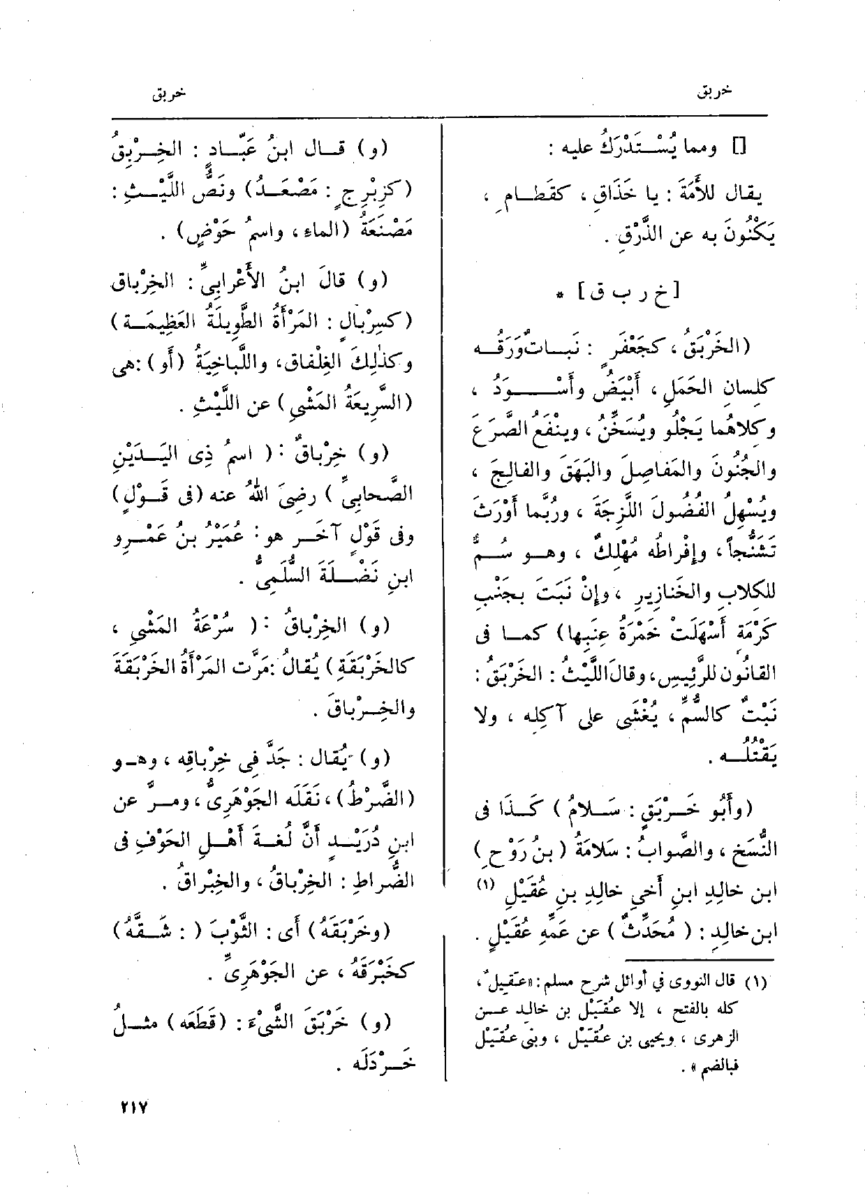 الخَرْبَقُ، كجَعْفَرً: نَبات وَرَقُه كلِسان الحَمَلِ أَبْيضُ وأَسْوَدُ، وكِلاهُما يَجْلُو ويسَخَنُ، وينْفَعُ الصَّرَعَ والجُنُونَ والمَفاصِلَ والبَهقَ والفالِجَ، ويُسْهلُ الفُضُولَ اللَّزِجَةَ، ورُبَّما أَوْرَثَ تَشَنُّجاً، وإفراطُه مُهْلِكٌ، وَهُوَ سُمّ للكِلاب والخَنازِيرِ، وإِنْ نَبَتَ بجنبِ كَرْمَةِ أًسهلتْ خمْرَةُ عِنبِها كَمَا فِي القانُون للرَّئِيسِ، وقالَ اللَّيْثُ: الخَرْبَقُ: نَبْتٌ كالسمُّ، يغْشَى على آكِلِه، وَلَا يَقْتُلُه. وأَبُو خَرْبقٍ: سَلامُ كَذَا فِي النسَخ، والصَّوابُ: سلامَةُ بنُ رَوْح ابْن خالِدِ ابنِ أَخي خالِدِ بنِ عُقَيْلِ ابْن خالِدِ: مُحَدَثٌ عَن عَمِّهِ عُقَيْلٍ. وقا ابْن عباد الخربق كزبرج مصعد وَنَصّ اللَّيْث مصنعة المَاء وَاسم الْحَوْض. وَقَالَ ابْن الْأَعرَابِي الْخِرْبَاق كسربال الْمَرْأَة الطَّوِيلَة الْعَظِيمَة وَكَذَلِكَ الغلفاق واللباخية أَو هِيَ السريعة الْمَشْي عَن اللَّيْث. وخرباق اسْم ذِي الْيَدَيْنِ الصَّحَابِيّ رَضِي الله عَنهُ فِي قَول وَفِي آخر هُوَ عُمَيْر بن عَمْرو ابْن نَضْلَة السلمى. والخرباق سرعَة الْمَشْي كالخربقة يُقَال مرت الْمَرْأَة الخربقة والخرباق. وَيُقَال جد فِي خرباقه وَهُوَ الضراط نَقله الْجَوْهَرِي وَمر عَن ابْن دُرَيْد أَن لُغَة أهل الحوف فِي الضراط الْخِرْبَاق والخبراق. وخربقه أَي الثَّوْب شقَّه كخبرقه عَن الْجَوْهَرِي. وخربق الشَّيْء قطعه مثل خردله.