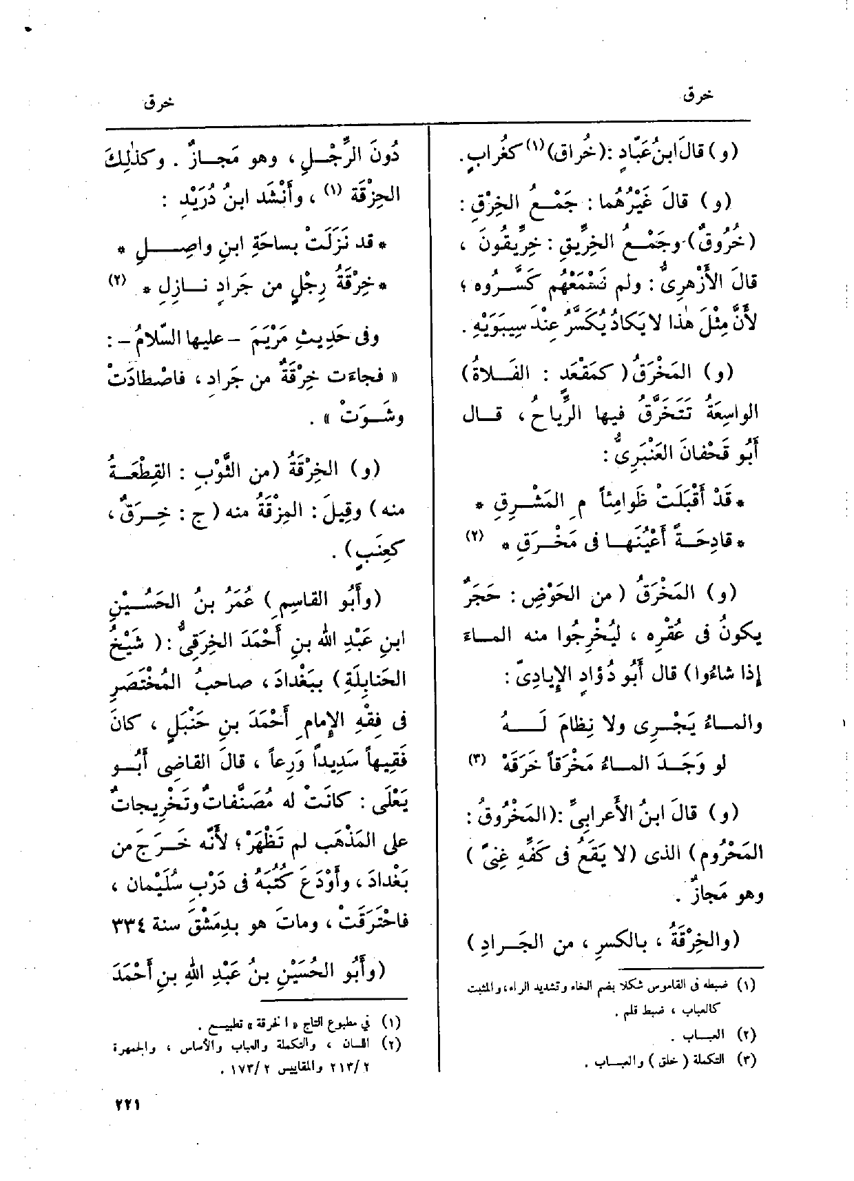 وقالَ ابنُ الأَعرابِيِّ: المَخْرُوقُ: المَحْرُوم الَّذِي لَا يَقَع فِي كَفِّهِ غِنىً وَهُوَ مَجازٌ. والخِرْقَةُ، بالكسرِ، من الجَرادِ دُونَ الرِّجْلِ، وَهُوَ مَجاز. وَكَذَا الحِزْقَة، وأَنْشد ابنُ دُرَيد: قد نَزَلَتْ بساحَةِ ابْن وَاصل خرقَة رِجلٍ من جَراد نازلِ وَفِي حَدِيثِ مَريمَ عَلَيْهَا السَّلَام: فَجَاءَت خرْقَة من جَرادِ، فاصطادت وشَوَت. والخِرْقَةُ من الثوبِ: القعطةُ مِنْهُ وقِيلَ: المزْقَة مِنْهُ ج: خِرق، كعِنَب. وأبُو القاسِم عُمَر بنُ الْحُسَيْن ابنِ عَبْدِ الله بنِ أَحْمَدَ الخرَقِي: شَيخ الحَنابِلَةِ ببَغْدادَ، صَاحب المُخْتَصرٍ فِي فِقْهِ الإِمام أَحْمَدَ بنِ حَنبل، كانَ فَقِيهاً سدِيداً ورِعاً، قالَ القَاضِي أَبُو يَعلَى: كَانَت لَهُ مُصَنَّفات وتَخْرِيجات على المَذهب لم تَظهَرْ، لأَنه خَرَج من بَغْدادَ، وأَوْدَعً كُتبَهُ فِي دربِ سُلَيْمَان، فاحْتَرَقَت، وماتَ هُوَ بدمَشْقَ سنة، وَأَبُو الحُسَيْنيِ بنُ عَبدِ اللهِ بن أَحْمَد