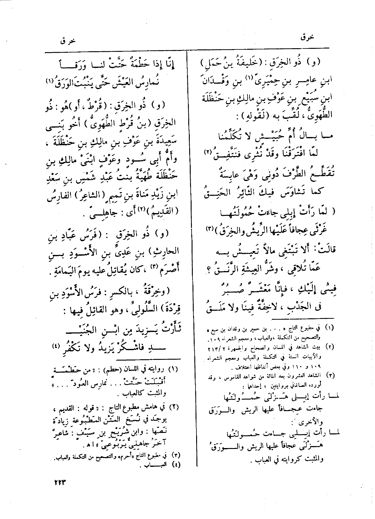 وذُو الخرَقِ: قُراط، أَو هُو: ذُو الخرَقِ بنُ قُرْطٍ الطهَوِيُّ أَخو بنِي سعِيدةَ بنِ عَوْفِ بنِ مالِكِ بنِ حَنْظَلَةَ وأَمُّ أَبِي سُودٍ وعَوْفٍ ابْنَي مالِكِ بنِ حَنْظَلَة طُهَيَّةُ بنت عَبْدِ شَمْسِ بنِ سَعْدِ ابنِ زَيْدِ مَناةَ بنِ تَمِيمٍ الشاعِرُ الفارِسُ القَدِيم أَي: جاهِلِيّ. وذُو الخِرَق: فَرَسُ عَبّادِ بنِ الحارِثِ بنِ عَدِيًّ بنِ الأَسْوَدِ بنِ أَصْرَم، كَانَ يُقاتِلُ عَلَيْهِ يومَ اليَمامَةِ. وخِرْقَةُ، بالكسرِ: فرسُ الأسوَدِ بنِ قِرْدَةَ السَّلُولِيِّ، وَهُوَ القائِلُ فِيها:
