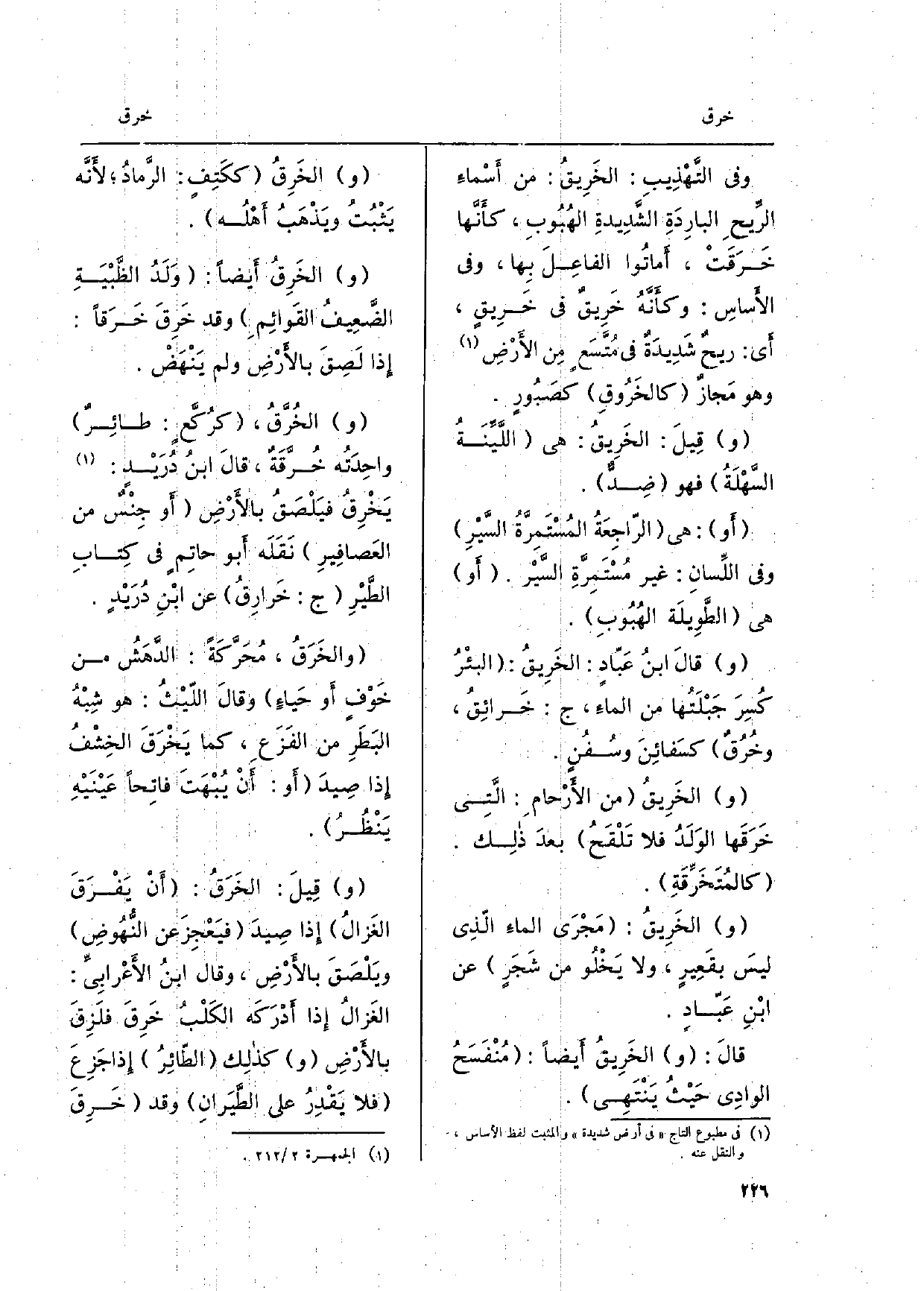 وَفِي التّهذيبِ: الخَرِيقُ: من أَسْماءَ الرِّيح البارِدَةِ الشَدِيدةِ الهبُوبِ، كأَنَّها خَرَقَتْ، أَماتُوا الفاعِلَ بِها، وَفِي الأَساسِ: وكأَنِّه خَرِيق فِي خَرِيقٍ، أَي: ريح شَديدَة فِي مُتسَعً مِن الأرْضِ وَهُوَ مجازٌ كالخَرُوق كصَبُور. وقِيلَ: الخَرِيقُ: هِيَ اللَّيِّنَة السهْلَةُ فَهُوَ ضِدّ. أَو: هِيَ الرّاجِعَةُ المُسْتَمِرة السَّيرِ وَفِي اللِّسانِ: غير مُسْتَمِرةِ السَّيْر. أَو هِيَ الطَّوِيلَة الهُبوبِ. وقالَ ابنُ عَبّادٍ: الخَرِيقُ: البئرُ كُسِرَ جَبْلَتُها من الماءَ، ج: خَرائِقُ، وخُرُق كسَفائِنَ وسُفُنٍ. والخَرِيق من الأَرْحام: الَّتِي خَرَقَها الوَلدُ فَلَا تَلْقَحُ بعدَ ذَلِك. كالمُتَخرقَةِ. والخَرِيقُ: مَجْرَى الماءَ الَّذِي ليسَ بقَعِيرٍ، وَلَا يَخْلُو من شَجَرٍ عَن ابْنِ عَبّادٍ. قالَ: والخَرِيقُ أَيضاً: مُنْفَسَحُ الوادِي حَيْث يَنْتَهي. والخَرق ككَتِفٍ: الرَّمادُ، لأَنَّه يَثْبت ويَذْهَبُ أَهْلُه. والخَرِقُ أَيضاً: وَلَدُ الظَّبيَةِ الضَّعِيفُ القَوائِم وَقد خَرِقَ خَرَقاً: إِذا لَصِقَ بالأرْضِ وَلم يَنْهَضْ. والخُرَّق، كرُكَّعٍ: طائِرٌ واحِدَتُه خُرَّقَة، قالَ ابنُ دُرَيْدٍ: يَخْرِقُ فيَلْصَق بالأَرْضِ أَو جنْس من العَصافِيرِ نَقَلَه أَبو حاتِم فِي كِتابِ الطَّيْرِ ج: خَرارِقُ عَن ابْنِ دُرَيْدٍ. والخَرَقُ، مُحرَّكَةً: الدَّهشُ من خَوْفٍ أَو حَياءَ وقالَ اللّيْث: هُوَ شبْهُ البَطَر من الفَزَع، كَمَا يَخْرَقَ الخِشْف إِذا صِيدَ أَو: أَنْ يُبْهَتَ فاتِحاً عَينَيْهِ يَنْظُر. وقِيلَ: الخَرَقُ: أَنْ يَفْرَقَ الغَزالُ إِذا صِيدَ فيَعْجِزَ عَن النُّهُوضِ ويَلصَقَ بالأَرْضِ، وَقَالَ ابنُ الأَعْرابِيِّ: الغَزالُ إِذا أَدْرَكَه الكَلْبُ خَرِقَ فلَزِقَ بالأَرْضِ وكذلِك الطّائِرُ إِذا جَزِعِ فَلَا يَقدرُ على الطَّيرَانِ وَقد خرق