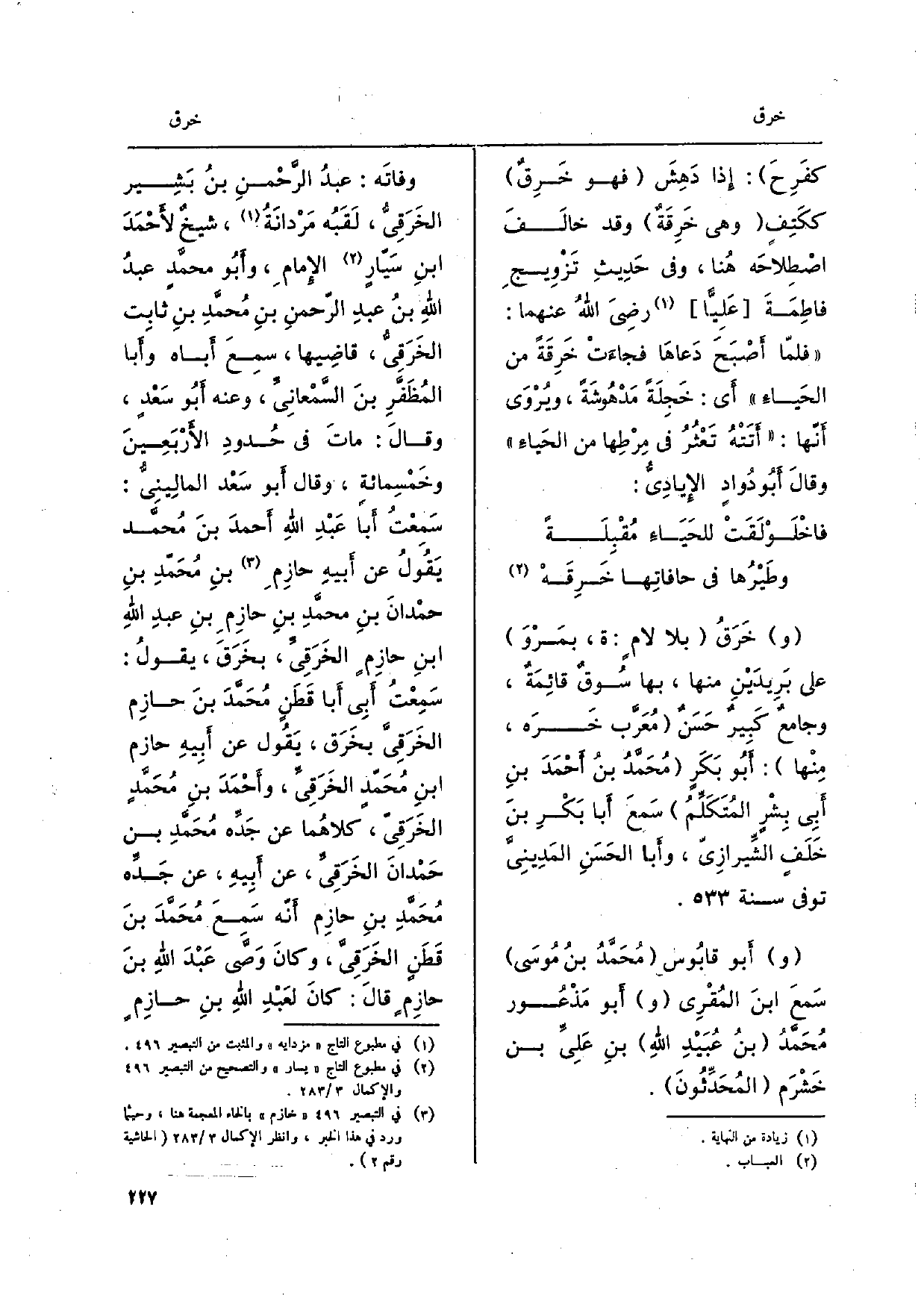 وخَرَقُ بِلَا لَام: ة، بمَرْوَ على بَريدَيْنِ مِنْهَا، بهَا سُوقٌ قائِمَةٌ، وجامع كَبِيرٌ حَسَن مُعَرَّب خَرَه، مِنْها: أَبُو بَكَرٍ مُحمَّد بن أَحْمَدَ بنِ أبِي بِشر المُتَكَلِّمُ سَمعَ أَبا بَكْرِ بنَ خَلَفٍ الشِّيرازِيّ، وأَبا الحَسَنِ المَدِينِي توفّي سنة. وَأَبُو قابُوس محَمَّدُ بنُ مُوسى سَمعَ ابنَ الفقْرِي وأَبو مَذْعُور مُحَمَّدُ بنُ عُبَيْدِ اللهِ بنِ عَلِيِّ بن خَشْرَم المُحَدِّثُونَ. وفاتَه: عبدُ الرَّحْمنِ بنُ بَشِير الخَرَقِيُّ، لَقَبُه مَرْدانَةُ، شيخ لأحْمَدَ ابنِ سَيّارٍ الإِمَام، وأبُو محمدٍ عبدُ اللهِ بنُ عبدِ الرّحمنِ بنِ مُحمَّدِ بنِ ثَابت الخَرَقِيًّ، قاضِيها، سمِع أَبَاهُ وَأبا المُظَفَّرِ بنَ السَّمْعانِيِّ، وَعنهُ أَبُو سَعدٍ، وقالَ: ماتَ فِي حُدودِ الأرْبَعِينَ وخَمْسِمائةِ،. وَقَالَ أَبو سَعْد المالِينِي: سَمِعْت أَباَ عَبْدِ اللهِ أَحمدَ بنَ مُحمد يَقُولُ عَن أَبيه حازِم بنِ مُحَمّدِ بنِ حمْدانَ بنِ محمَّدِ بنِ حازِمٍ بنِ عبدِ اللهِ ابْن حازِم الخَرَقِيِّ، بخَرَق، يقولُ: سَمِعْتُ أَبِيَّ أَبا قَطَنٍ مُحَمَّدَ بنَ حازِم الخَرَقِيَّ بخَرَق، يَقُول عَن أَبِيهِ حَازِم ابنِ مُحَمَّد الخَرَقِيِّ، وأَحْمَدَ بنِ مُحَمد الخَرَقِيّ، كلاهُما عَن جَدِّه مُحَمدِ بن حَمْدانَ الخَرَقِيِّ، عَن أبِيهِ، عَن جَدِّه محَمدِ بنِ حازِم أَنّه سَمعَ مُحَمدَ بنَ قَطَنٍ الخَرَقِيَّ، وكانَ وَصًّى عَبْدَ اللهِ بنَ حَازِم قالَ: كانَ لعَبْدِ اللهِ بن حَازِم