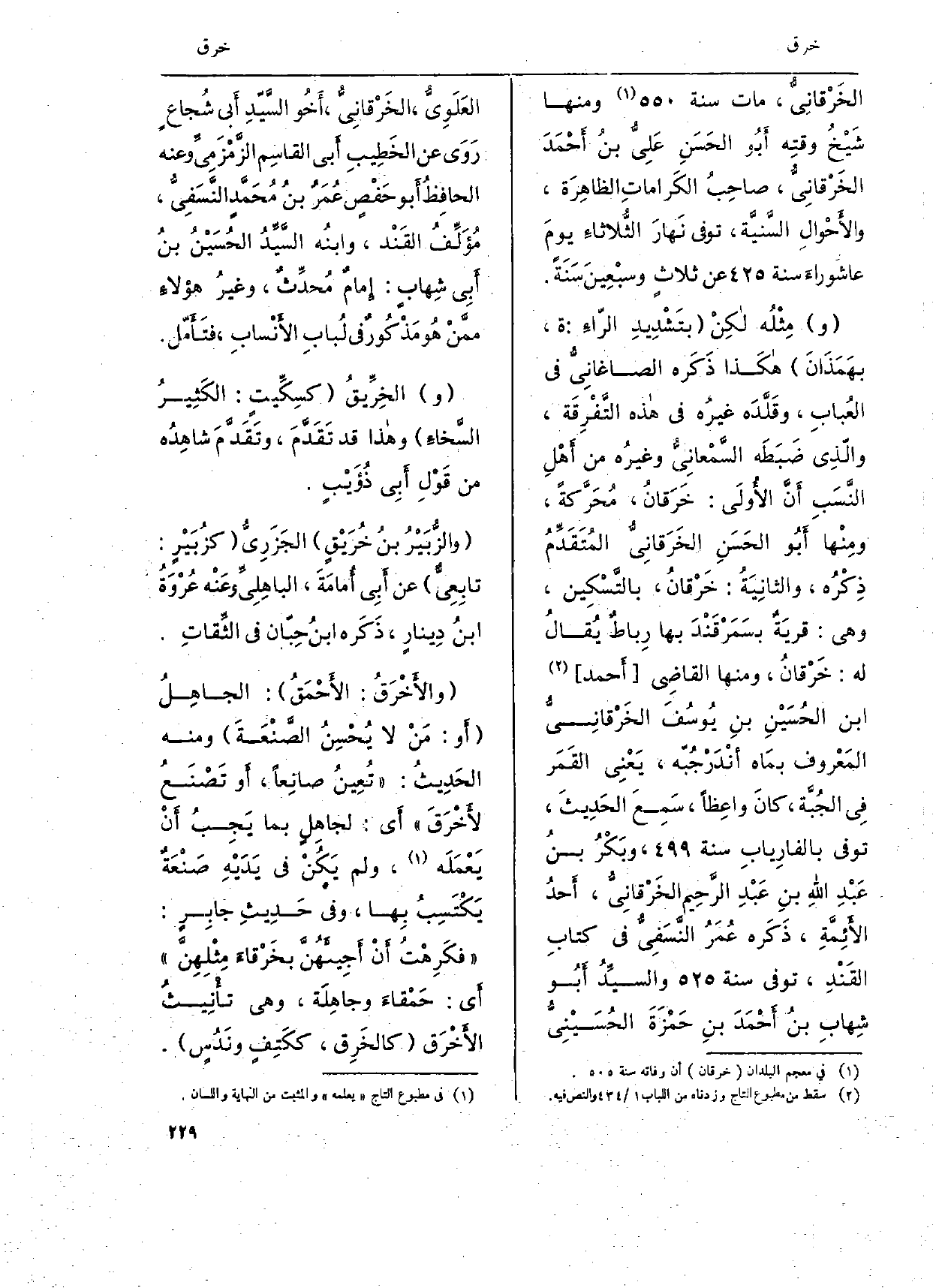 الخَرقاني مَاتَ سنة، وَمِنْهَا شيخ وقته أَبو الحسَنِ عَلي بن أَحْمَد الخَرْقانِيّ، صاحِبُ الكَراماتِ الظاهرَة، والأَحوالِ السّنيَّة، توفّي نهارَ الثلاثاءِ يَوْم عاشَوراء سنة، عَن ثلاثٍ وسبْعِين سنة. ومِثْله لكِن بتَشدِيدِ الراءِ: ة، بهَمَذَانَ هَكَذَا ذَكَره الصاغانِي فِي العُبابِ، وقَلَّدَه غيرُه فِي هَذِه التَّفرِقَة، والذِي ضَبَطَه السمْعاني وَغَيره من أَهلِ النَّسَبِ أَن الأولى: خَرَقان، مُحَركة، ومِنْها أَبُو الحَسنِ الخَرَقانِي المتَقدم ذِكْره، والثانيَة: خَرقان، بالتَسكِين، وَهِي: قريَة بسمرقندَ بهَا رِباط يُقالُ لَهُ: مخَرْفانُ، وَمِنْهَا القاضِي أَحْمد ابْن الحُسَين بنِ يوسفَ الخَرقانِيُّ المَعْروف بمَاه أندَرْجُبه، يَعنِي القَمَر فِي الْجُبَّة كانَ واعِظاً، سَمِع الحَدِيثَ، توفّي بالفارِياب سنة، وبَكْر بنُ عَبْدِ اللهِ بنِ عَبْدِ الرَّحِيم الخَرقانِيُّ، أحد الأئِمَّةِ، ذَكَره عمَرُ النَّسَفِي فِي كتابِ القَنْدِ، توفّي سنة، وَالسَّيِّد أَبُو شهَاب بنُ أَحْمَدَ بنِ حَمْزةَ الحسَيْنِي العَلَوِي، الخَرقانِي، أَخُو السَّيّدِ أّبي شُجَاع رَوَى عَن الخَطِيبِ أَبي القاسمِ الزمْزَمِيِّ وَعنهُ الحافِظُ أَبو حّفص عمَر بن محَمد النَّسفِي، مؤلف القَند، وَابْنه السَّيِّد الحسَيْن بن أَبي شهَاب: إِمَام مُحدث، وَغير هؤلاءَ مِمَّن هُو مّذكور فِي لبابِ الأنسابِ، فَتَأمل، والخِرَيقُ كسِكِّيت: الكَثِيرُ السخْاءَ وَهَذَا قد تَقَدمَ، وَتقدم شاهِده من قوْل أَبي ذؤَيب. والزبيرُ بن خرَيقٍ الجَزَرِيُّ كزُبَير: تابِعِيّ عَن أَبِي أمامَةَ، الباهِليِّ وعنْه غروَة ابْن دِينَار، ذَكره ابْن حَيَّان فِي الثِّقَات. والأخْرَق: الأحمق: الجاهِل أَو: من لَا يحسِنُ الصنعَةَ وَمِنْه الحَدِيث: تُعِينُ صانِعاً، أَو تَصْنَيعُ لأخرَقَ أَي: لجاهِل بِمَا يَجِبُ أنْ يَعمَلَه، وَلم يَكن فِي يَدَيهِ صَنْعَة يَكْتسِب بهَا، وفيْ حَدِيثِ جابِرٍ: فكَرِهت أَن أَجيئهن بخرقاء مِثْلهن أَي: حَمقاء وجاهلَة، وَهِي تَأْنِيث الأخْرق كالخَرِق، ككَتِف ونَدس.
