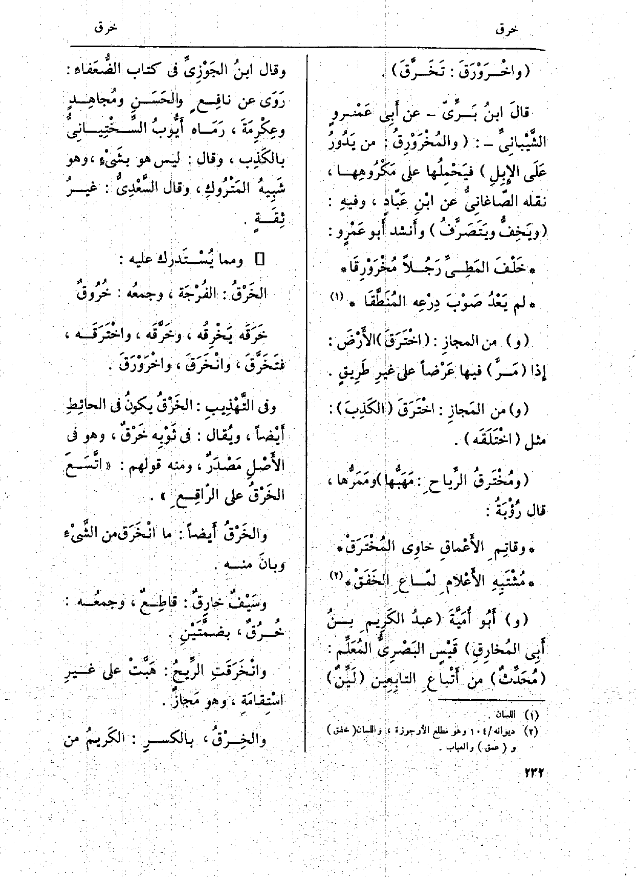 قالَ ابْن بَرِّيّ عَن أَبِي عَمروٍ الشَّيباني والمُخْرَورقُ: من يَدُور عَلَى الإبلِ فيحملها على مَكْروهها، نَقله الصاغانِي عَن ابنِ عَباد، وفيهِ: ويَخِف ويَتَصَرّف وأَنشد أَبو عَمْرو:) خْلف المَطِي رجُلاً مُخرَوْرِقَا لم يَعْدُ صَوْبَ دِرْعِه المنَطَّقَا وَمن الْمجَاز: اختَرَقَ الأَرضَ: إِذا مَر فِيهَا عَرْضاً على غيرِ طَرِيقٍ. وَمن المَجاز: اختَرقَ الكَذِبَ: مثل اختلقه. ومُختَرق الرياحَ: مهبها ومَمَرها، قَالَ رؤبة: وقاتِم الأعْماقِ خاوِي المختَرَق مُشْتَبِهِ الْأَعْلَام لماع الخَفَق وأَبو أمَيةَ عبد الكَريمِ بنُ أَبِي المُخارقِ قَيْس البَصْري المُعَلم: مُحَدِّث من أتباعِ التابِعِين لين وَقَالَ ابْن الجَوْزي فِي كتاب الضْعَفاءَ: رَوَى عَن نافِع والحّسَنِ ومجاهِدِ وعِكرِمَةَ، رَمَاه أيوبُ السِّختياني بالكَذب، وَقَالَ: لَيْسَ هُوَ بِشَيْء، وَهُوَ شَبِيه المَتروك، وَقَالَ السَّعْدِيّ: غير ثقَة.
