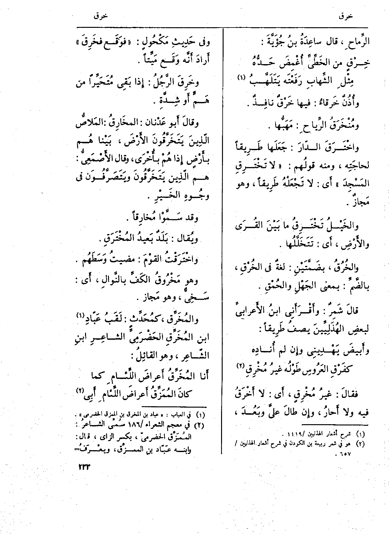 فقالَ: غير مُخْرِقٍ، أَي: لَا أَخْرَقُ فِيهِ وَلَا أَحار، وإِن طالَ عليَّ وبَعُدَ، وَفِي حَدِيثِ مَكْحُولٍ: فَوَقع فخَرِقَ أرادَ أَنَّه وَقَع مَيِّتاً. وخَرِقَ الرَّجُلُ: إَذا بَقي متحَيِّراً من هَم أَو شِدة. وقالَ أَبو عَدْنان: المخَارق الملاص الّذِينَ يَتَخَرَّقُونَ الأرضَ، بَينا هم بأرْضٍ إِذا هُمْ بأخرَى، وَقَالَ الأصمَعِي: هم الّذِين يَتَخَرَّقُون ويتصرفون فِي وجُوهِ الخَيرِ. وَقد سَمَّوْا مخارِقاً. وَيُقَال. بَلَدٌ بَعيدُ)
