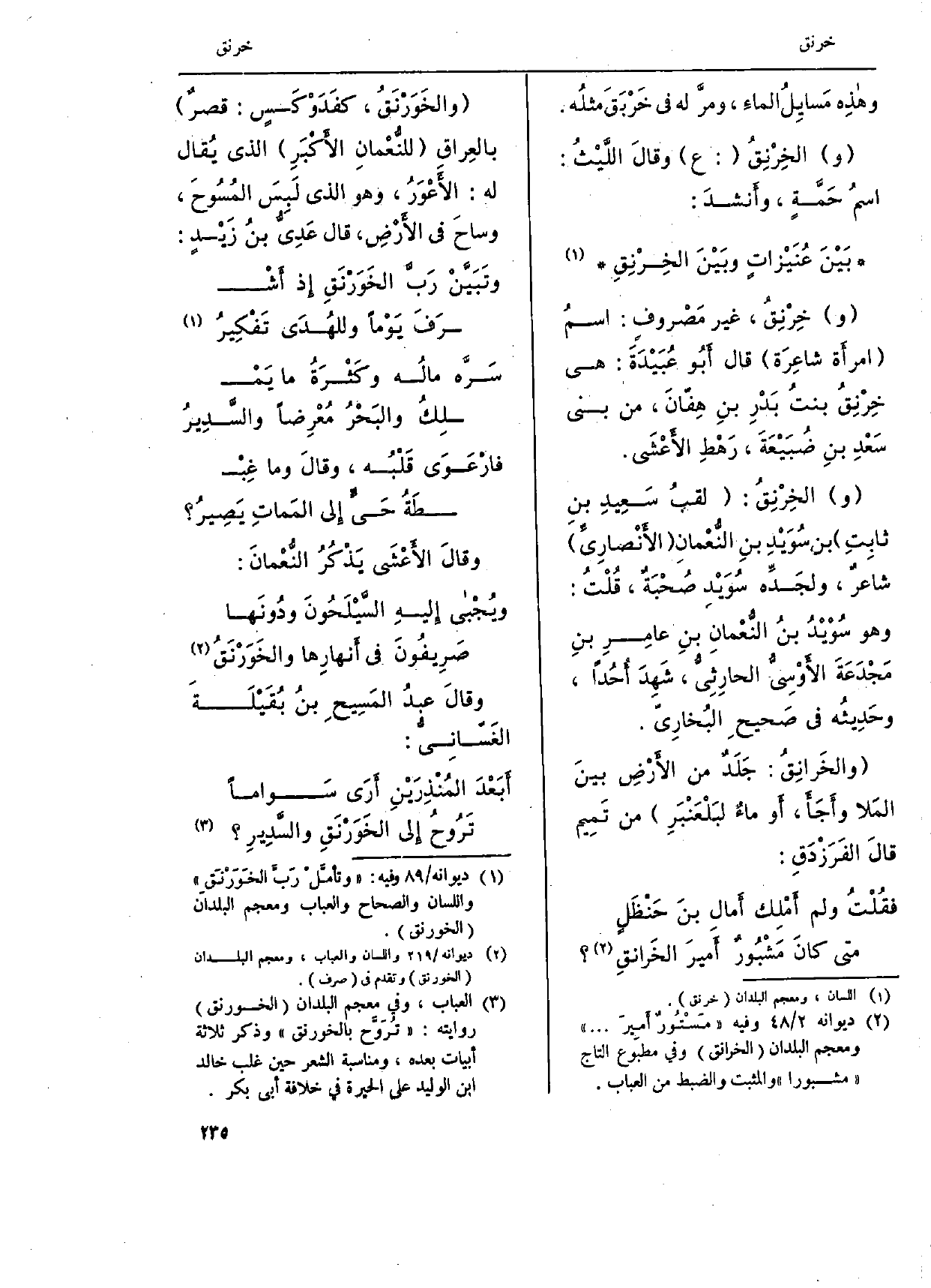 وهذِه مَسايلُ الماءَ، ومرَّ لَهُ فِي خَرْبَقَ مثلُه. والخِرْنِق: ع وقالَ اللَّيْثُ: اسمُ حَمَّةٍ، وأَنشدَ: بَيْنَ عُنَيْزاتٍ وبَيْنَ الخِرْنِقِ وخِرْنِقُ، غير مَصْروف: اسْم امرأَة شاعِرَة قَالَ أَبُو عُبَيْدَةَ: هِيَ خِرْنِقُ بنتُ بَدْرِ بنِ هِفّانَ، من)