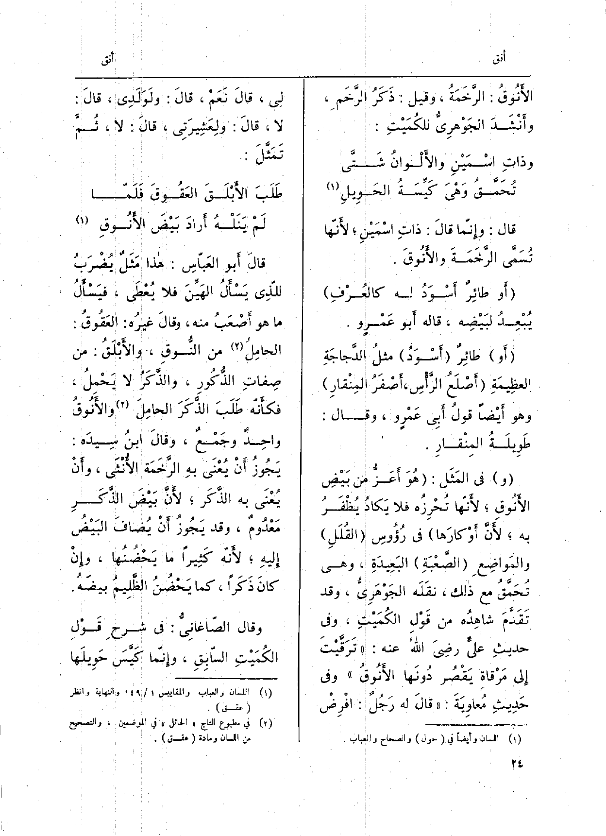 {الأنَوقَ: الرخَمَة، وَقيل: ذَكَرُ الرخم وأّنشد الجوهرِيّ للكمَيت:
